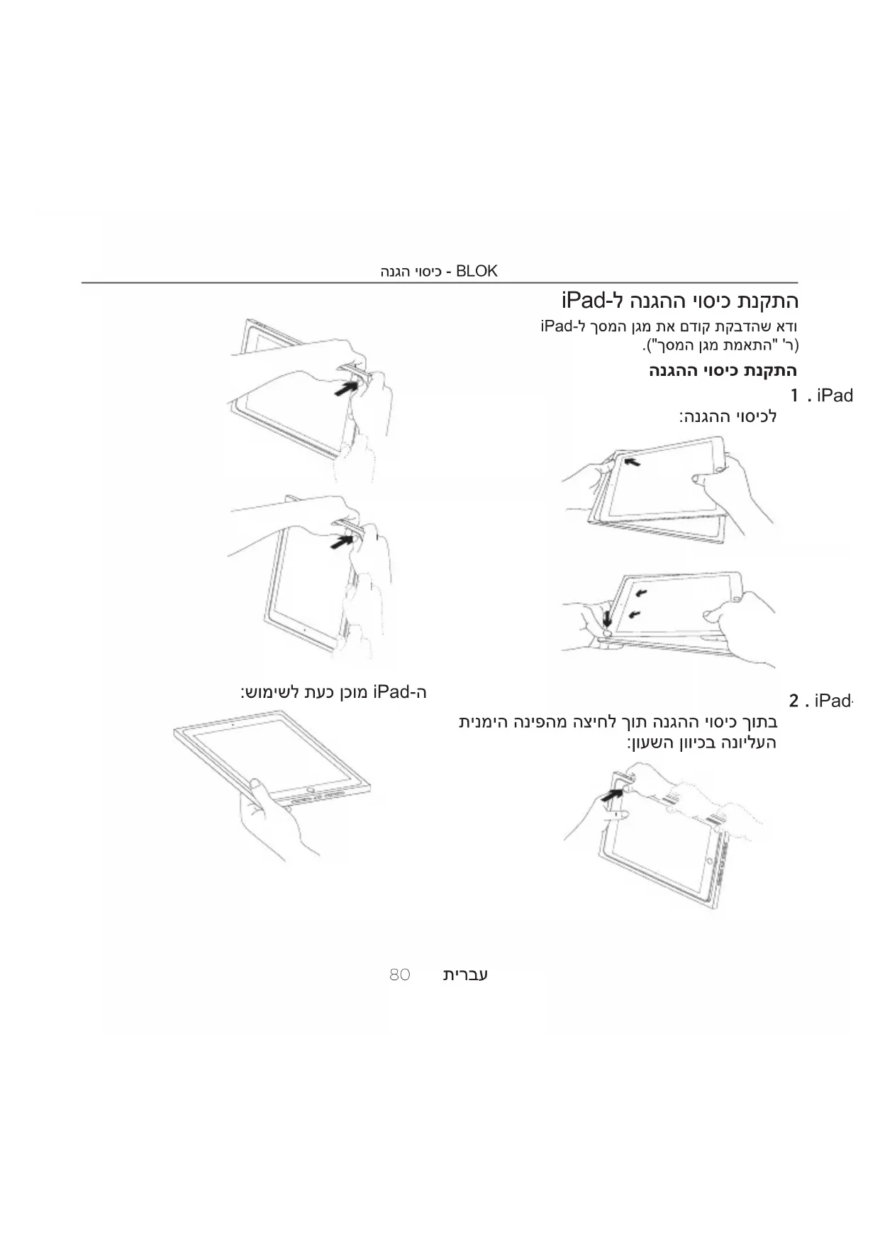 2 .הנגה יוסיכ 3 .תוינזוא עקשל השיג חתפ 4 .המלצמל השיג חתפ 5 .יוביכ/הקלדה ןצחלל השיג 6 .ןופורקימל השיג חתפ 7 .עמש תרקב ינצחלל השיג 8 .רצומ דועית80 תירבע הנגה יוסיכ - BLOK iPad-ל הנגהה יוסיכ תנקתה iPad-ל ךסמה ןגמ תא םדוק תקבדהש אדו .)"ךסמה ןגמ תמאתה" 'ר( הנגהה יוסיכ תנקתה 1 . iPad-ה לש ןוילעה וקלח תא סנכה :הנגהה יוסיכל 2 . iPad-ה תא עבקל ידכ ךילדוגאב שמתשה תינמיה הניפהמ הציחל ךות הנגהה יוסיכ ךותב :ןועשה ןוויכב הנוילעה :שומישל תעכ ןכומ iPad-התירבע 81 הנגה יוסיכ - BLOK הנגהה יוסיכמ iPad-ה קותינ 1 . לש הנוילעה תינמיה הניפה תא רוחאל ףופכ :הנגהה יוסיכ 2 . לש הנותחתה תינמיה הניפה תא רוחאל ףופכ :הנגהה יוסיכ 3 . :הנגהה יוסיכמ iPad-ה תא אצוה :תעכ ררחושמ iPad-ה82 תירבע הנגה יוסיכ - BLOK רצומה לש הכימתה רתאב רקב הכימתו ףסונ עדימ טנרטניאב אוצמל ןתינ רתאב רקבל עגר ךל חק .רצומב תנווקמ יוסיכ לע דוע דומלל ידכ רצומה לש הכימתה .ךלש שדחה הנגהה ,הנקתה אשונב הרזעל םינווקמ םירמאמב ןייע .תופסונ תונוכת לע עדימו שומיש תוצע רבחתה תונורתפ ףותישו תולאש ,תויוצעייתהל .ונלש םימורופב םירחא םישמתשמל בחר רחבמ אוצמל לכות ,תינכטה הכימתה רתאב :תוברל ,םינכת לש