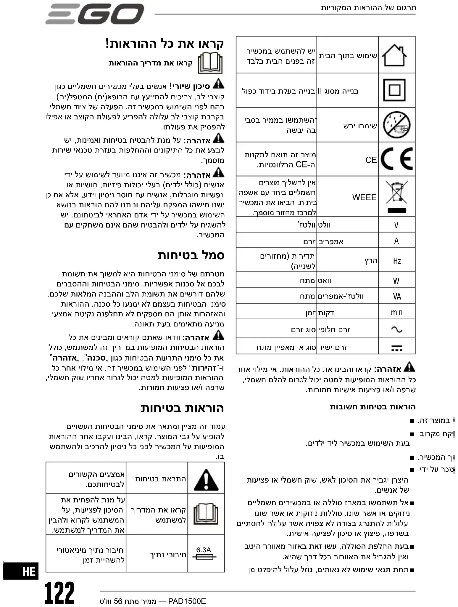 מצא את מדריך המכשיר בחינם PAD1501E EGO בפורמט PDF.