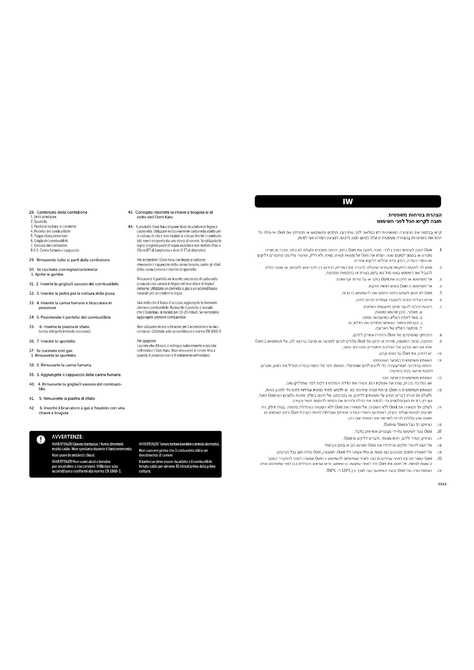 carbonella. Utilizzate esclusivamente carbonella adatta per la cottura di cibi e non iniziate la cottura finché il combusti- bile non è ricoperto da uno strato di cenere. Se utilizzate la legna scegliete pezzi di legna asciutta e non trattata (fino a 20cm (8”) di lunghezza e 4cm (1.5”) di diametro). Per accendere l’Ooni Karu con legna o carbone: rimuovete il cappuccio della canna fumaria, aprite gli sfiati della canna fumaria e inserite lo sportello. Rimuovete il portello ed inserite uno strato di carbonella o una piccola catasta di legno nel bruciatore di legno/ carbone. Utilizzate un cannello a gas o un accendifuoco naturale per accendere la legna. Una volta che il fuoco è accesso aggiungete lentamente ulteriore combustibile. Reinserite il portello e lasciate che l’Ooni Karu si riscaldi per 10-20 minuti. Se necessario aggiungete ulteriore combustibile. Non utilizzate alcool o benzine per l’accensione o la riac- censione. Utilizzate solo accendifuoco a norma EN 1860-3. Per spegnere Lasciate che il fuoco si estingua naturalmente e lasciate rareddare l’Ooni Karu. Non rimuovere le ceneri fino a quando il prodotto non si è totalmente rareddato. AVVERTENZE: AVVERTENZE! Questo barbecue / forno diventerà molto caldo. Non spostarlo durante il funzionamento. Non usare in ambienti chiusi. AVVERTENZE! Non usare alcol o benzina per accendere o riaccendere. Utilizzare solo accendifuoco conformi alla norma EN 1860-3. AVVERTENZE! Tenere lontani bambini e animali domestici. Non cuocere prima che il carburante abbia un rivestimento di cenere Il barbecue deve essere riscaldato e il combustibile tenuto caldo per almeno 30 minuti prima della prima cottura; תיטפשמ תוחיטב תרהצה שומישה ינפל לכה אורקל הבוח לכ יולימ-יא .Ooni תא וקזחתת וא ושמתשתו וניקתת ,וביכרתש ינפל האולמב וזה תיטפשמה הרהצהה תא השקבב וארק .תוומל ףאו הרומח העיצפל ,שוכרל קזנל םורגל לולע וז תיטפשמ הרהצהב תורכזומה תוארוהה 1 . היינח וא הנבמ ךותב אל םלועלו םינבממ בחרה ,ץוחב Ooni תא םקמל הבוח .דבלב ץוחב שומישל ןנכות Ooni םיקילד םירמוחמ יקנ וילע ורמישו ,קילד אלו ןזואמ ,חישק חטשמ לע Ooni תא וחינה .רוגס םוקמל ךומסב וא הרוקמ .םירחא םיקילד םילזונו םיזג ,ןיזנב ,הריעב-ירמוח וא 2 . םילוכי םהש וא ,םינבמל ץוח-ירונת ןיב שורדה קחרמה תא רידגהל םילוכיש םיימוקמ תונקתלו םיקוחל בל ומיש .תונכוסמ תופוקתב וא תרוצב ןמזב גוס לכמ שאב שומישה תא ליבגהל 3 ..םינאוורקו תוריס לע וא ךותב Ooni תא וניקתת וא ושמתשת לא 4 ..תוקזח תוחור שישכ Ooni-ב ושמתשת לא 5 ..הזככ וב שמתשהל ןיאו םומיח-רונתכ שמשל ןנכות אל Ooni 6 ..קנחל םורגל םילולעו רבטצהל םילוכי םיליער םידא 7 . :תכתמה תפטעמל ץוחמ רועבל תולוכי תובהל ;תאצמנ שאהש ןכיה ,רוחאמ .א ;חתפנ הסכמהשכ ןוילעה חתפל לעמ .ב וא ;תלדה תא םיחתופ םתאשכ רונתה תמדקב .ג .הבוראה לש ןוילעה הצקהמ .ד 8 ..םכדיל םירחא וריהזהו Ooni לש םיחתפהמ וקחרתה 9 . Ooni-ב ושמתשת לא ,ןכל .שוכרב העיגפ וא העיצפל םורגל םילולע Ooni לש ןוקית וא תוריש ,המאתה ,יוניש ,הנקתה .בטיה םיגרבומו םירבוחמ םיקלחה לכו בכרומ אוה םא אלא .0 ..עובק סיסב לע Ooni תא קודבל שי .. .:םחפ/ץעה רעבמב םישמתשמ םתאשכ םורגתו ,שאה תא לידגת הריעב-רמוח ידמ רתוי תפסוה .ילמיטפוא םוחל עיגהל ידכ הריעב-רמוח הגרדהב ופיסוה .רישכמבו םכב העיגפ תנכסל .2 .:זגה רעבמב םישמתשמ םתאשכ .בוש וקילדתש ינפל תוקד 5 וניתמהו תלדה תא וריסה ,זגה תקפסא תא ורגס ,תיבכנ הבהלה םא .3 . ,תויווכ עונמל ידכ םוחל תודימע תופפכ דימת שובלל שי .ווכי םכידיש הנכס תמייק ,Ooni-ב םישמתשמ םתאשכ .לעופ Ooni-שכ םהשלכ תכתמ יקלחב ועגית לא .םתברקב וא ,םיקילד םיחטשמ לע םימח םירבד וחינת לא םלועלו .הריעב-רמוח תפסוהל חתפה תא םירהלו תלדה תא חותפל ידכ קיטסלפ/ץעה תוידיב קר ועג .4 . ויה .קלוד ודועב החותפ תלדהשכ החגשה אלל Ooni תא וריאשת לא .החגשה אלל Ooni תא וריאשת לא םלועל וב שומישה ןמזב Ooni תברקב תויהל תולולעש )םירחא הריעב-ירמוחו ץע-תפצר ,םישבי םילע( תונכסל םיעדומ .ןהב ועגי תוצוצינ םא הפירשל םורגל תולולע ןהש םושמ .5 ..Ooni-מ ילמשח לבכ לכ וקיחרה 16 ..דבלב םיארחא םירגובמ ידי-לע שומישל דעונ Ooni .7 ..Ooni-מ םיקילד םירבדו ,דמחמ-תויח ,םידלי דימת וקיחרה .8 ..לושיבה ןמזב וא םח אוהשכ Ooni תא זיזהל וא םיקלח ריסהל וסנת לא .9 ..םינוויכה לכב םוח טלופ Ooni ,השעמל .Ooni דיל התצה-לזונ וא תיצמ ומכ םינכוסמ םיצפח וריאשת לא 20 . ךשמב ררקתהל רונתל ורשפא Ooni-ב שמתשהל םתמייסש רחאל .ובכ תובהלהש רחאל םג םח ראשנ Ooni .ותוא ונסחאתש ינפל ובכ םילחגהו שאהש ואדוו ,שומיש וב השענש רחאל דימ Ooni תא וסכת לא .תו