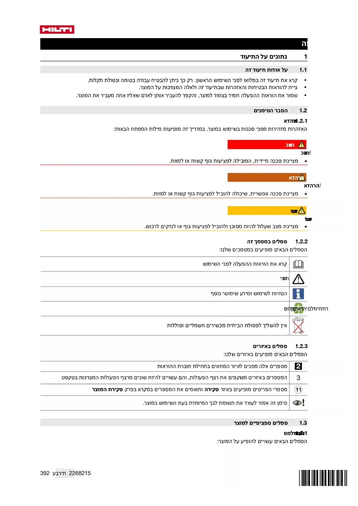 סמליהאיסורהבאיםמופיעיםעלהמוצר: הובלהבאמצעותמנוףאסורה 1.4מדבקותמיוחדותעלהמוצר אזהרה:שואבזהמכילאבקמסוכןלבריאות.רקבעלימקצועהמשתמשיםבציודהגנהמתאיםרשאיםלבצעאתפעולותהריקון והתחזוקהכוללהסילוקשלשקיתהאבק.ישלהשתמשבשואבהאבקאךורקכאשרמותקנתבומערכתהסינוןבשלמותהוהיא תקינהלגמרי. אחתממדבקותהאזהרההבאותנמצאתעלהשואב: VC 20L-X VC 40L-X מדבקתאזהרהבשואביL: ודאשמדבקתהאזהרהגלויההיטב. VC 20M-X VC 40M-X מדבקתאזהרהבשואביL: ודאשמדבקתהאזהרהגלויההיטב. 1.5פרטיהמוצר המוצריםשלHiltiמיועדיםלמשתמשהמקצועי,ורקאנשיםמורשים,שעברוהכשרהמתאימה,רשאיםלתפעל,לתחזקולתקן אותם.אנשיםאלהחייביםללמודבאופןמיוחדאתהסכנותהאפשריות.המוצרהמתוארוהעזריםשלועלוליםלהיותמסוכנים כאשראנשיםשלאעברוהכשרהמתאימהמשתמשיםבהםבאופןלאמקצועיאוכאשרנעשהבהםשימוששלאבהתאםלייעוד. שםהדגםוהמספרהסידורימצויניםעללוחיתהדגם. ◀רשוםאתהמספרהסידוריבטבלההבאה.בכלפנייהלנציגינואולמעבדתשירותישלצייןאתנתוניהמוצר.