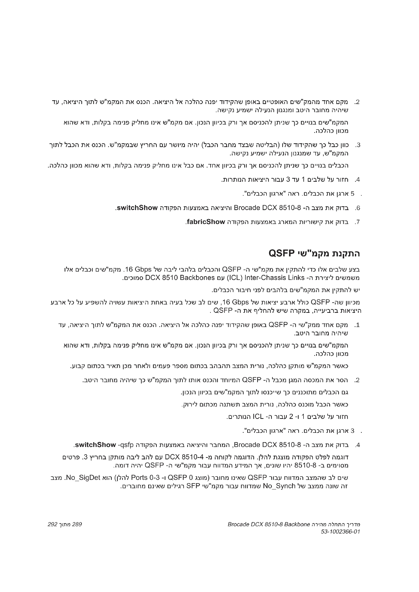 1 תבשות 12 תבשות 2 יליבקמ גוס - רויא5 8510 לש המגודל הרוצת – QSFP לבכ ירוביח רויאב םנמא .הטמל רויאב גצומש יפכ ,)בהל עברא/הביל םייתש( בהל/הביל תרוצתב 8510 תובשות שש רבחל ןתינ המגודה יפל תויהל הכירצ טוויחה תמיכס .8510-8 וא 8510-4 תויהל הלוכי תבשותה ךא ,8510-8 תובשות תוגצומ .םדוקה רויאב תגצומש תיליבקמהBrocade DCX 8510-8 Backbone הריהמ הלחתה ךירדמ 292 ךותמ 280 53-1002366-01 רויא4 QSFP ש"מקמו לבכ QSFP לבכ תנקתה . QSFP לבכ ףילחהל ידכ םיאבה םיבלשה תא עצב