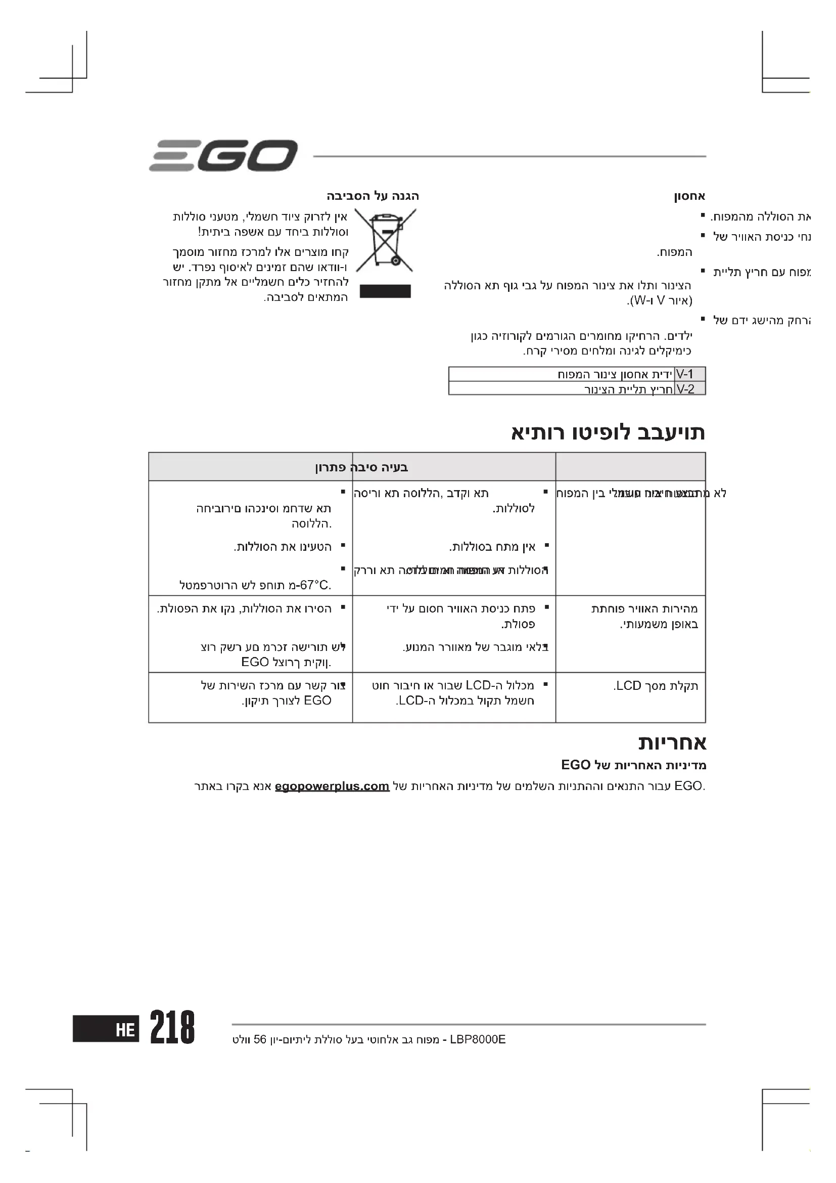 .חופמהמ הללוסה תא רסה לש ריוואה תסינכ יחתפמ םירזה םירמוחה לכ תא וקנ תיילת ץירח םע חופמה רוניצ ןוסחא תידי תא ורשיי הללוסה את ףוג יבג לע חופמה רוניצ תא ולתו רוניצה .)W-ו V רויא( לש םדי גשיהמ קחרה רוגס םוקמב ילכה תא ונסחא ןוגכ היזורוקל םימרוגה םירמוחמ וקיחרה .םידלי.חרק יריסמ םיחלמו הניגל םילקימיכחופמה רוניצ ןוסחא תידי V-1רוניצה תיילת ץירח V-2 הביבסה לע הנגה תוללוס ינעטמ ,ילמשח דויצ קורזל ןיא!תיתיב הפשא םע דחיב תוללוסו ךמסומ רוזחמ זכרמל ולא םירצומ וחק שי .דרפנ ףוסיאל םינימז םהש ואדוו-ו רוזחמ ןקתמ לא םיילמשח םילכ ריזחהל.הביבסל םיאתמה איתור וטיפול בבעיות ןורתפ הביס היעב הסירו את הסוללה, בדקו את החיבורים והכניסו מחדש אתהסוללה. חופמה ןיב ילמשח רוביח עצבתמ אל .תוללוסל.דבוע וניא חופמה .תוללוסה תא וניעטה .תוללוסב חתמ ןיא קררו את הסוללות או המפוח עד לטמפרטורה של פחות מ-67°C. .ידמ םימח חופמה וא תוללוסה .תלוספה תא וקנ ,תוללוסה תא וריסה ידי לע םוסח ריוואה תסינכ חתפ .תלוספ תתחופ ריוואה תוריהמ.יתועמשמ ןפואב צור קשר עם מרכז השירות של EGO לצורך תיקון. .עונמה ררוואמ לש רבגומ יאלב לש תורישה זכרמ םע רשק רוצ .ןוקית ךרוצל EGO טוח רוביח וא רובש LCD-ה לולכמ .LCD-ה לולכמב לוקת למשח.LCD ךסמ תלקת