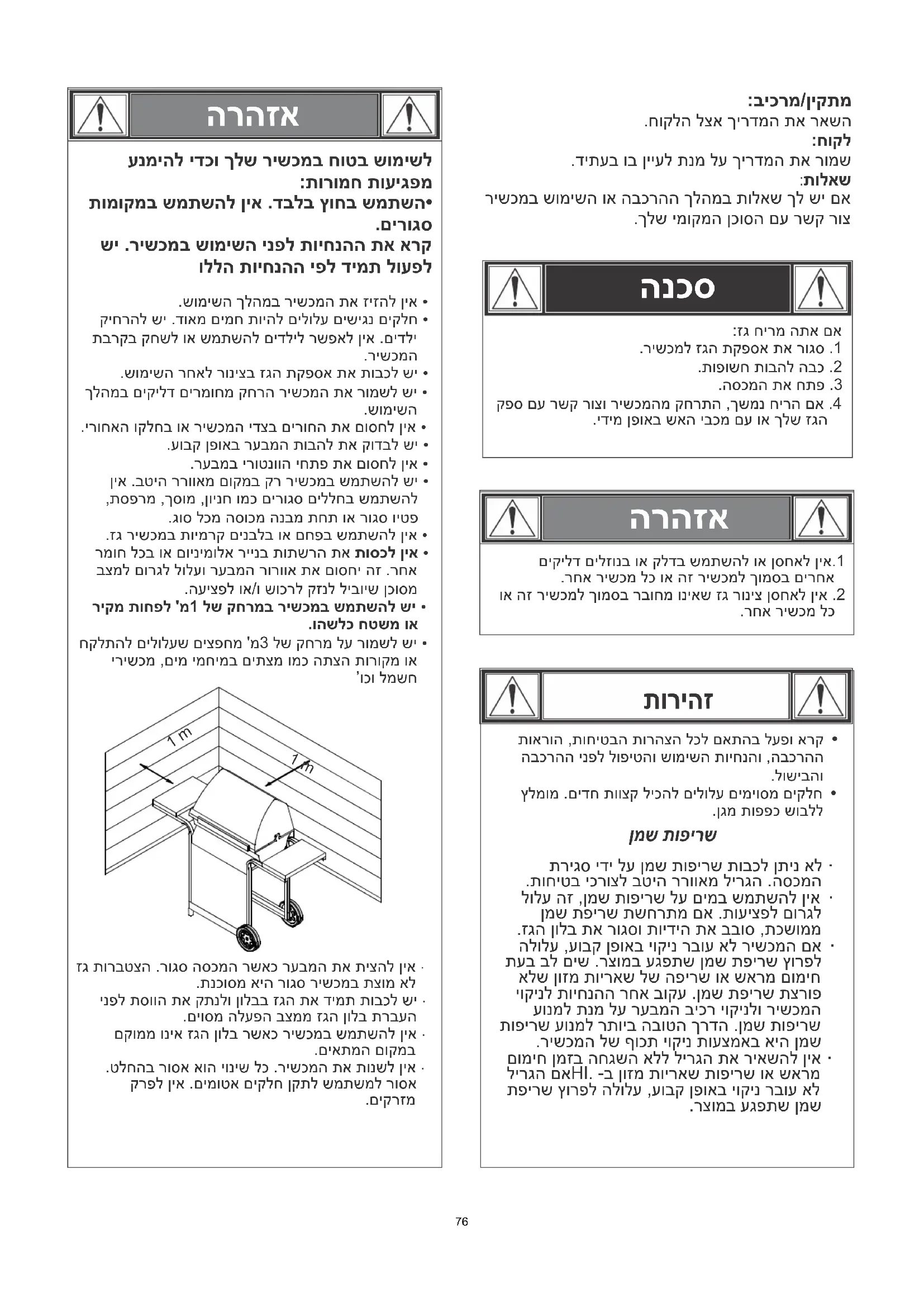 .הללוסה תא קודב ,לילצ ןיא םא Ÿ .יוארכ תמקוממ הללוסהש אדוו Ÿ .ףלחהו לודומב םיטוחה לש םייופר םירוביח שפח Ÿ תסוולו רוניצל ,םימותסשל הפילד תקידב ,הנשב םעפ תוחפל ,ןושארה שומישה ינפל תופילד קודב.ןולבה לש קותינ וא הפלחה שיש םעפ לכבו בצמל רישכמב תוידיה לכ תא רבעה.1.זגה ןולבל הקודה הרוצב רבוחמ תסווהש אדוו.2. הבכ ,החירב לש לוק עמוש התא םא .זגה תא לעפה.3.רוביחב תיתועמשמ הפילד שי .ידימ ןפואב זגה תא.ךישמתש יפל ןקת .(םימ יצחו ןובס יצח לש תבורעת) ןובס תסימת שרבה.4.רוניצה ירוביח לע ןולבב זגה תא הבכ .הפילד שי ,העוב העיפומ םא.5 ןתינ אל םא .םיקודה םירוביחה א קודבו ידימ ןפואב.ףוליח יקלח ןמזה .ןקתל הסנת לא ,הפילדה תא רוצעל תקידב עוציב רחאל ןולבב זגה תא הבכ דימת.6.תופילדה קודב ,השלח הבהלהש וא לירגה תא קילדהל השק םא וא םישיבכע .םירעבמהו ירוטנווה יחתפ תא הקנו התצה בוכיע לש תויעבל םורגל םיטונ םינטק םיקרח ירוטנווה יחתפב םיציב םיליטמו םינק םימיקמ םה רשאכ.זגה רבעמ תא םימסוחו לירגה לש רעבמב וא .הרקבה חול ירוחאמ תצומ תויהל לולע רבטצמה זגה .העיצפל םורגלו לירגב עוגפל לולע התצהב הזה בוכיעה ויהי םיעוציבהש אדוולו התצהב םיבוכיע עונמל תנמ לע תורוניצ תאו רעבמה תא תוקנלו ריסהל שי ,םיניקת הפוקתל שומיש אלל דמע לירגהש רחאל ירוטנווה.תכשוממ t oCylinder PlacementCylinder of 6 kg or less may be placed on the ground under the side shelf or inside the appliance in place provided. Larger cylinders are to be placed under side shelf or behind the grill only. Cylinders placed in the appliance shall have a maximum diameter of ccutmm and maximum height of ccutmm. Cylinders placed on the ground shall not be placed under the hot plate.t oCylinder PlacementCylinders are to be placed under side shelf or behind the grill only. Cylinders placed on the ground shall not be placed under the hot plate.iioal im ha rala: CHICL CH-BIL, LLC pplia am Ga Bar/Ga Grill oal omial Ha Ip 5,28 (384,2 /h) Ga Caory I3(28-30/37) ol o. 468210017, 468211017 Ga yp