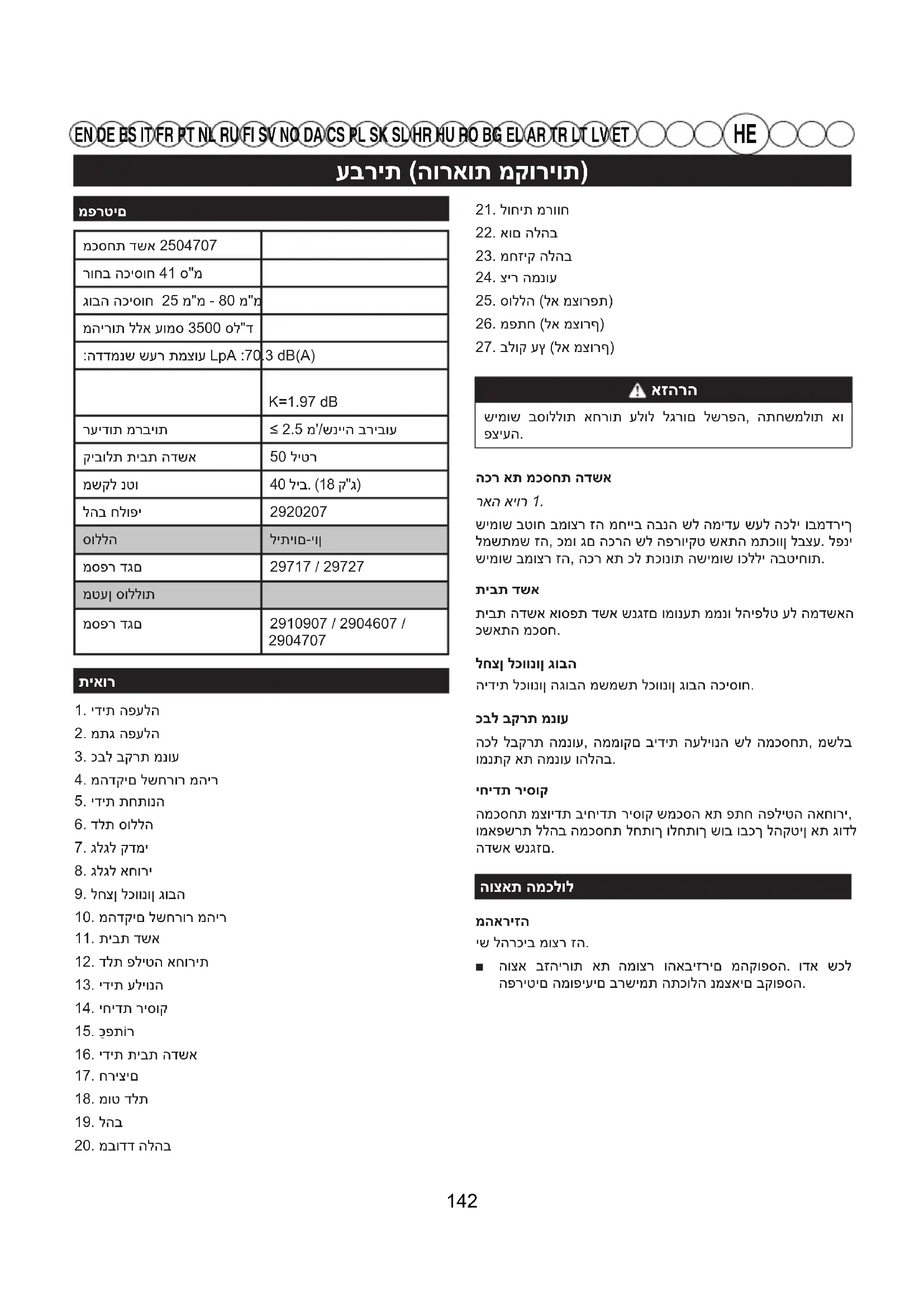 EN DE ES IT FR PT NL RU FI SV NO DA CS PL SK SL HR HU RO BG EL AR TR LT LV ET מפרטיםמכסחת דשא 2504707 רוחב הכיסוח 41 ס"מגובה הכיסוח 25 מ"מ - 80 מ"ממהירות ללא עומס 3500 סל"ד:הדדמנש שער תמצוע LpA :70.3 dB(A):תחטבומ שער תמצוע LwA :90.3 dB(A), K=1.97 dBרעידות מרביות ≤ 2.5 מ'/שנייה בריבועקיבולת תיבת הדשא 50 ליטרמשקל נטו 40 ליב. (18 ק"ג)להב חלופי 2920207סוללה ליתיום-יוןמספר דגם 29717 / 29727מטען סוללותמספר דגם 2910907 / 2904607 / 2904707תיאור1. ידית הפעלה2. מתג הפעלה3. כבל בקרת מנוע4. מהדקים לשחרור מהיר5. ידית תחתונה6. דלת סוללה7. גלגל קדמי8. גלגל אחורי9. לחצן לכוונון גובה10. מהדקים לשחרור מהיר11. תיבת דשא12. דלת פליטה אחורית13. ידית עליונה14. יחידת ריסוק15. כַּפתר16. ידית תיבת הדשא17. חריצים18. מוט דלת19. להב20. מבודד הלהב21. לוחית מרווח22. אום הלהב23. מחזיק הלהב24. ציר המנוע25. סוללה (לא מצורפת)26. מפתח (לא מצורף)27. בלוק עץ (לא מצורף)