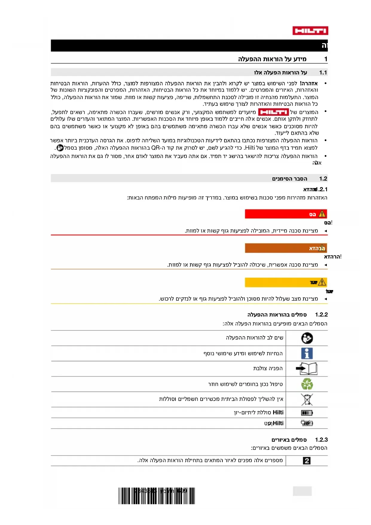 - הוראותההפעלההמצורפותנכתבובהתאםלידיעותהטכנולוגיותבמועדהשליחהלדפוס.אתהגרסההעדכניתביותראפשר למצואתמידבדףהמוצרשלHilti.כדילהגיעלשם,ישלסרוקאתקודה-QRבהוראותההפעלההאלה,מסומןבסמל.