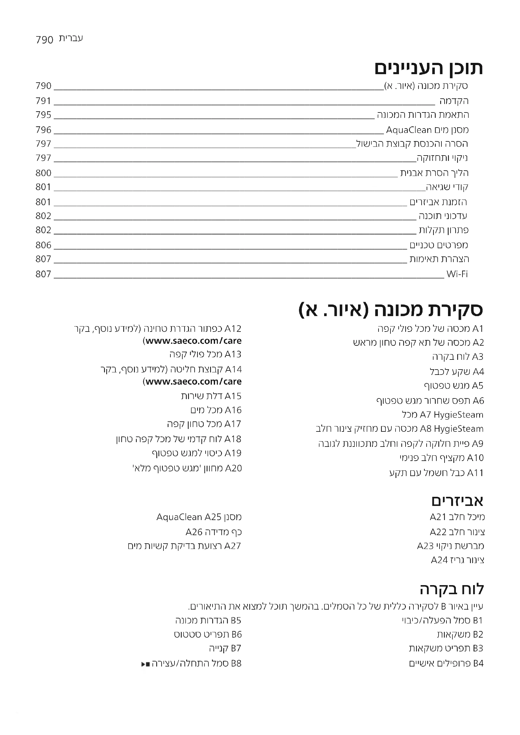 םיניינעה ןכות 790 _______________________________________________________________________(א .רויא) הנוכמ תריקס 791 __________________________________________________________________________________ המדקה 795 _____________________________________________________________________ הנוכמה תורדגה תמאתה 796 _______________________________________________________________________ AquaClean םימ ןנסמ 797 _________________________________________________________________לושיבה תצובק תסנכהו הרסה 797 ______________________________________________________________________________הקוזחתו יוקינ 800 __________________________________________________________________________ תינבא תרסה ךילה 801 ________________________________________________________________________________האיגש ידוק 801 ____________________________________________________________________________ םירזיבא תנמזה 802 ______________________________________________________________________________ הנכות ינוכדע 802 ______________________________________________________________________________ תולקת ןורתפ 806 ____________________________________________________________________________ םיינכט םיטרפמ 807 ____________________________________________________________________________ תומיאת תרהצה 807 ____________________________________________________________________________________ Wi-Fi (א .רויא) הנוכמ תריקס הפק ילופ לכמ לש הסכמ A1 שארמ ןוחט הפק את לש הסכמ A2 הרקב חול A3 לבכל עקש A4 ףוטפט שגמ A5 ףוטפט שגמ רורחש ספת A6 לכמ A7 HygieSteam בלח רוניצ קיזחמ םע הסכמ A8 HygieSteam הבוגל תננווכתמ בלחו הפקל הקולח תייפ A9 ימינפ בלח ףיצקמ A10 עקת םע למשח לבכ A11 רקב ,ףסונ עדימל) הניחט תרדגה רותפכ A12 (www.saeco.com/care הפק ילופ לכמ A13 רקב ,ףסונ עדימל) הטילח תצובק A14 (www.saeco.com/care תוריש תלד A15 םימ לכמ A16 הפק ןוחט לכמ A17 ןוחט הפק לכמ לש ימדק חול A18 ףוטפט שגמל יוסיכ A19 'אלמ ףוטפט שגמ' ןווחמ A20