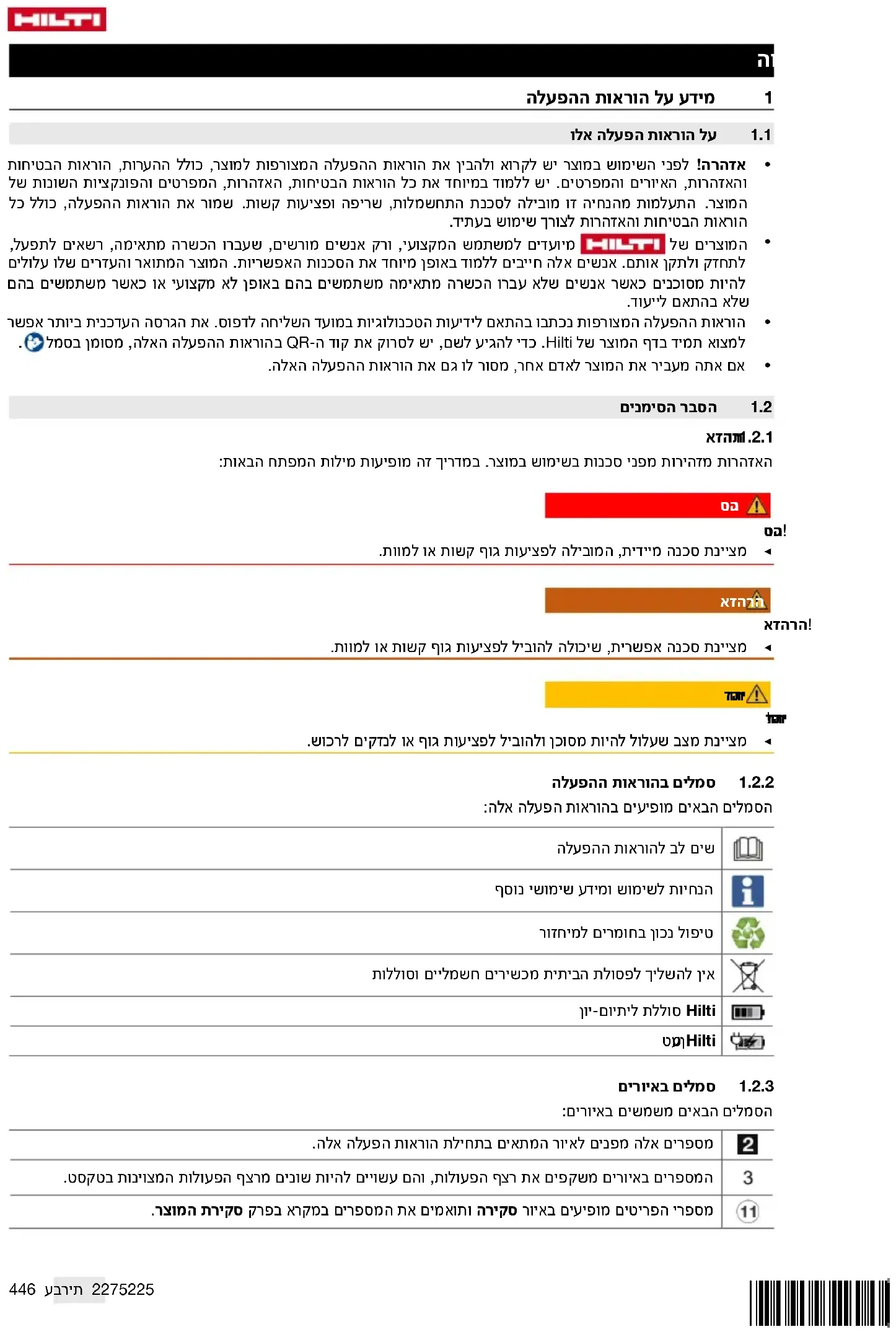 - הוראותההפעלההמצורפותנכתבובהתאםלידיעותהטכנולוגיותבמועדהשליחהלדפוס.אתהגרסההעדכניתביותראפשר למצואתמידבדףהמוצרשלHilti.כדילהגיעלשם,ישלסרוקאתקודה-QRבהוראותההפעלההאלה,מסומןבסמל.