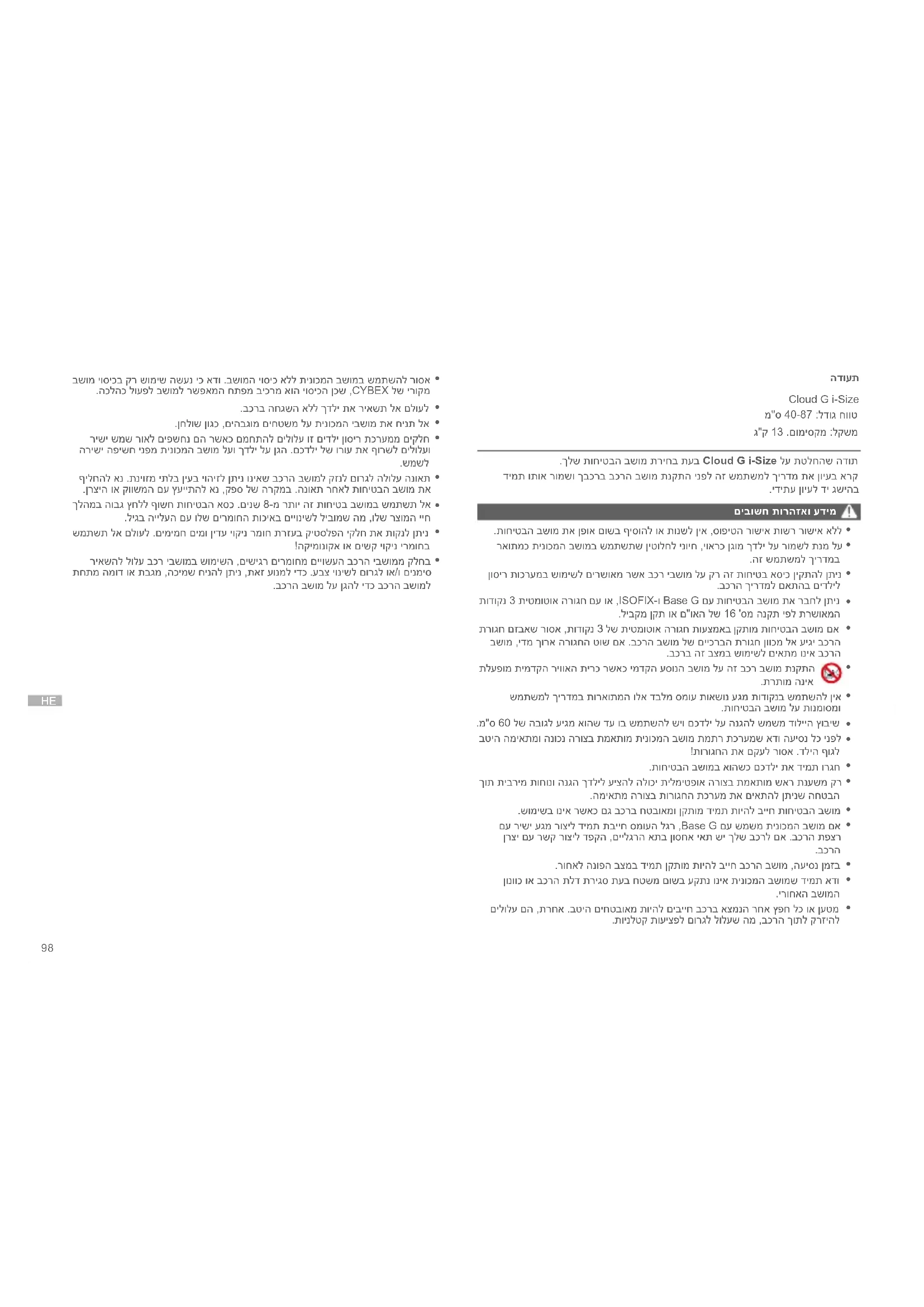 Cloud G i-Size מ"ס 40-87 :לדוג חווט ג"ק 13 .םומיסקמ :לקשמ .ךלש תוחיטבה בשומ תריחב תעב Cloud G i-Size לע תטלחהש הדות דימת ותוא רומשו ךבכרב בכרה בשומ תנקתה ינפל הז שמתשמל ךירדמ תא ןויעב ארק .ידיתע ןויעל די גשיהב םיבושח תורהזאו עדימ