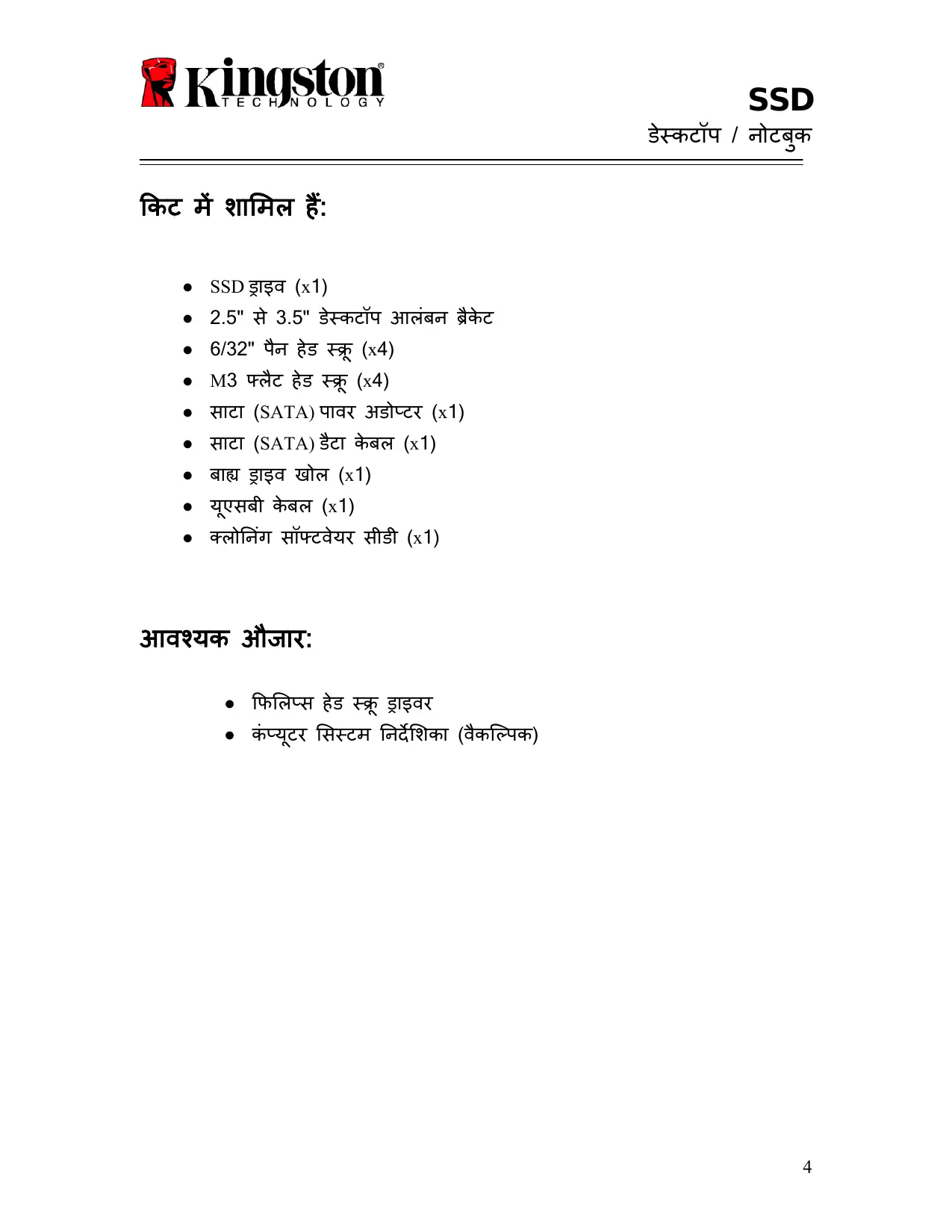 ककट भें शार्भर हैं: ● SSD ड्राइव (x1) ● 2.5" से 3.5" डेस्कटॉऩ आरॊफन ब्रैकेट ● 6/32" ऩैन हे ड स्िू (x4) ● M3 फ्रैट हे ड स्िू (x4) ● साटा (SATA) ऩावय अडोप्टय (x1) ● साटा (SATA) डैटा केफर (x1) ● फाह्य ड्राइव खोर (x1) ● मूएसफी केफर (x1) ● क्रोननॊग सॉफ्टवेमय सीडी (x1) आवश्मक औजाय: ● कपर्रप्स हे ड स्िू ड्राइवय ● कॊप्मूटय र्सस्टभ ननदे र्शका (वैकस्पऩक)