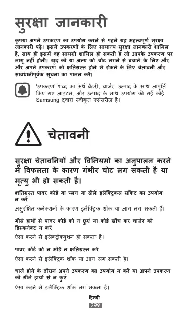 सुरक्षा जानकारी कृपया अपने उपकरण का उपयोग करने से पहले यह महत्वपूर्ण सुरक्षा जानकारी पढ़ें । इसमें उपकरणों के लिए सामान्य सुरक्षा जानकारी शामिल है , साथ ही इसमें वह सामग्री शामिल हो सकती है जो आपके उपकरण पर लागू नहीं होती। खुद को या अन्य को चोट लगने से बचाने के लिए और और अपने उपकरण को क्षतिग्रस्त होने से रोकने के लिए चेतावनी और सावधानीपूर्वक सूचना का पालन करें । 'उपकरण' शब्द का अर्थ बैटरी, चार्जर, उत्पाद के साथ आपूर्ति किए गए आइटम, और उत्पाद के साथ उपयोग की गई कोई Samsung द्वारा स्वीकृत एसेसरीज़ है ।