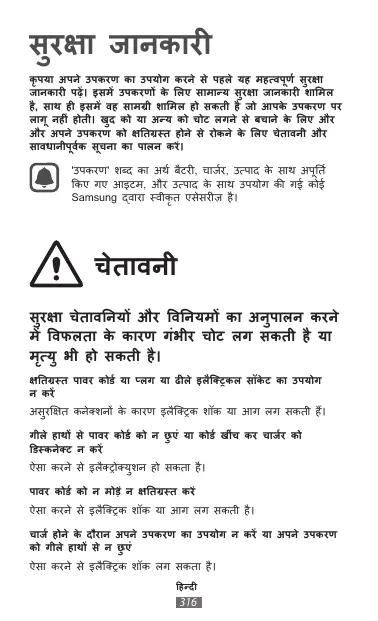 सुरक्षा जानकारी कृपया अपने उपकरण का उपयोग करने से पहले यह महत्वपूर्ण सुरक्षा जानकारी पढ़ें । इसमें उपकरणों के लिए सामान्य सुरक्षा जानकारी शामिल है , साथ ही इसमें वह सामग्री शामिल हो सकती है जो आपके उपकरण पर लागू नहीं होती। खुद को या अन्य को चोट लगने से बचाने के लिए और और अपने उपकरण को क्षतिग्रस्त होने से रोकने के लिए चेतावनी और सावधानीपूर्वक सूचना का पालन करें । 'उपकरण' शब्द का अर्थ बैटरी, चार्जर, उत्पाद के साथ अपूर्ति किए गए आइटम, और उत्पाद के साथ उपयोग की गई कोई Samsung द्वारा स्वीकृत एसेसरीज़ है ।