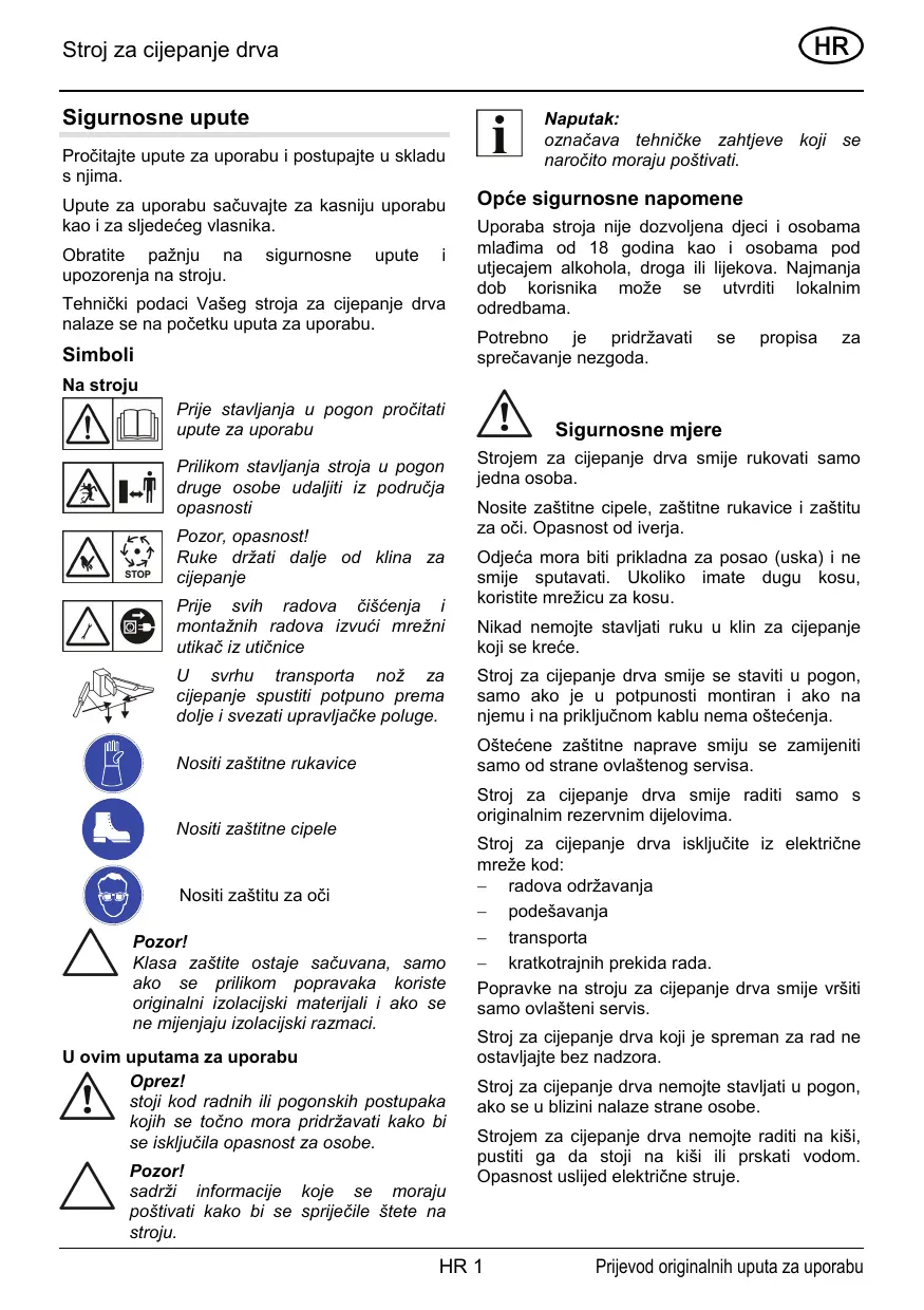 Lucrul la despicătorul de lemne este permis a fi efectuat de o singură persoană. Se va purta încălţăminte de protecţie, mânuşi de protecţie şi protecţii pentru ochi. Pericol datorat aşchiilor de lemn. Îmbrăcămintea trebuie să fie adecvată (strânsă) şi nu trebuie să reducă mobilitatea. Părul lung se va purta neapărat prins cu plasă. Nu se va introduce niciodată mâna în zona penei de despicare în mişcare. Despicătorul de lemne poate fi pus în funcţiune numai dacă acesta este complet montat şi dacă despicătorul şi conducta de conectare nu prezintă deteriorări. − lucrări de întreţinere − lucrări de reglare − transport − întreruperi de scurtă durată a lucrului Reparaţiile la despicătorul de lemne pot fi efectuate numai de către o întreprindere specializată. Despicătorul de lemne gata de funcţionare nu se va lăsa nesupravegheat. Nu se pune în funcţiune despicătorul de lemne dacă în apropiere se află persoane neimplicate.