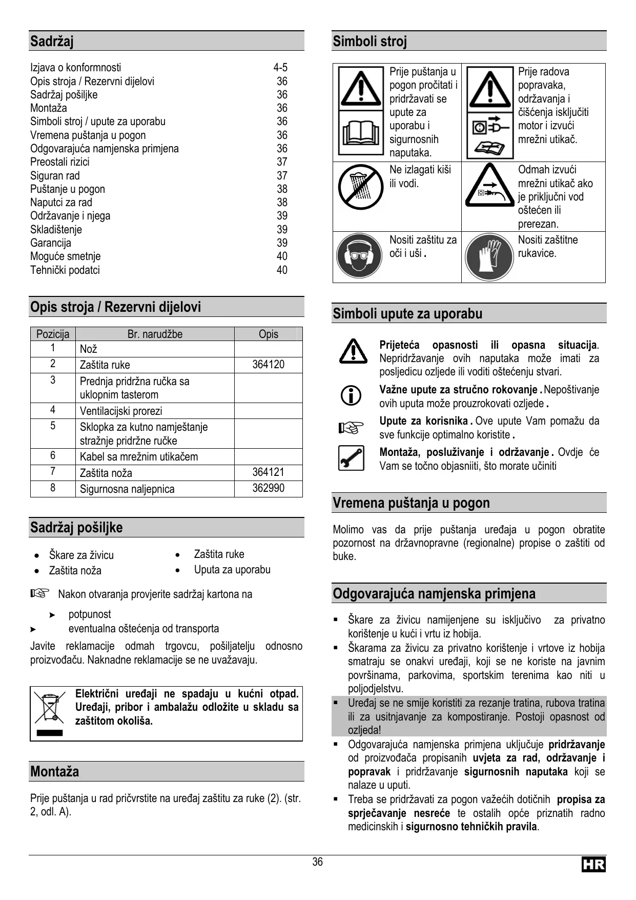 Type Désignation du modèle Puissance du moteur P1 Tension d’alimentation / Fréquence du réseau Régime à vide n0 Longueur de couteau Longueur de coupe Epaisseur de lame Passage de branches Vibration main-bras EN 1033/DIN 45675 Niveau sonore Lwa (selon la directive 2000/14/CE) Niveau de pression acoustique LPA (selon la directive 2000/14/CE) Poids Classe de protection