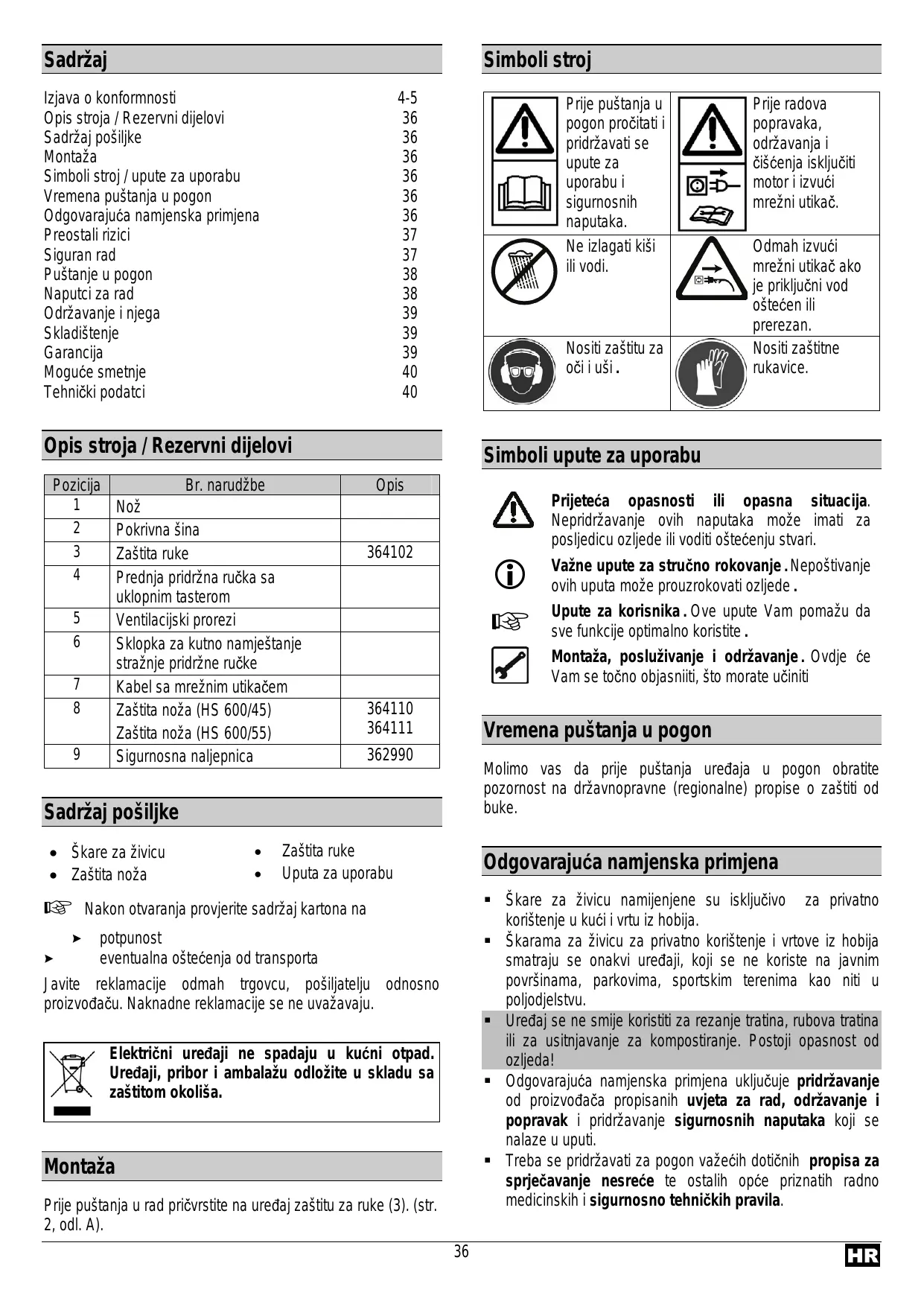 Pièces de rechange Pos. 1 2 Poignée avant avec bouton d'interruption Fentes d'aération Poignée arrière avec interrupteur Câble avec fiche de secteur Protection des couteaux (HS 600/45) Protection des couteaux (HS 600/55) Etiquette de sécurité
