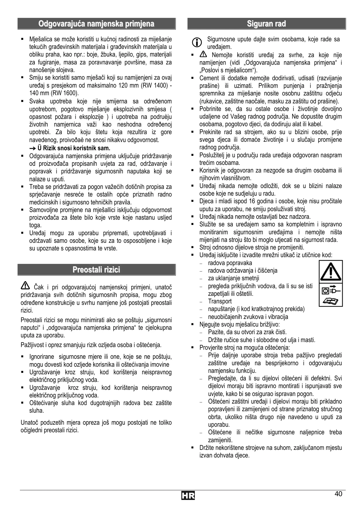Eviter de toucher, d'aspirer ou d'avaler le ciment ou les additifs (développement de poussières). Pour remplir et vider le conteneur de mélange, porter des équipements de protection personnelle (gants, lunettes, masque).