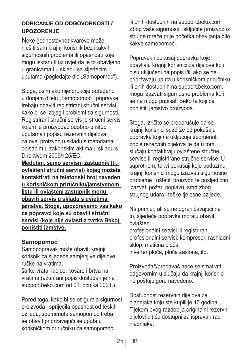 également disponible à l'adresse support. beko.com au 1er mars 2021). En outre, pour garantir la sécurité du produit et éviter tout risque de blessure grave, l'autoréparation mentionnée doit être effectuée en suivant les instructions du manuel d'utilisation pour l'autoréparation ou qui sont disponibles danssupport.beko.com Pour votre sécurité, débranchez le produit avant de tenter toute autoréparation. Les réparations et tentatives de réparation par les utilisateurs finaux pour les pièces ne figurant pas dans cette liste et/ou ne suivant pas les instructions des manuels d'utilisation pour l'autoréparation ou qui sont disponibles dans support. beko.com, pourrait donner lieu à des problèmes de sécurité non imputables à Beko, et annulera la garantie du produit. Il est donc fortement recommandé aux utilisateurs finaux de s'abstenir de tenter d'effectuer des réparations ne figurant pas sur la liste des pièces de rechange mentionnée, en s'adressant dans ce cas à des réparateurs professionnels autorisés ou à des réparateurs professionnels agréés. Au contraire, de telles tentatives de la part des utilisateurs finaux peuvent causer des problèmes de sécurité et endommager le produit et, par la suite, provoquer un incendie, une inondation, une électrocution et des blessures corporelles graves. Sans être exhaustives, les réparations suivantes par exemple doivent être effectuées par des personnes qualifiées :les réparateurs professionnels ou les réparateurs professionnels agréés : compresseur, circuit de refroidissement, carte mère,carte de convertisseur, carte d’affichage, etc.