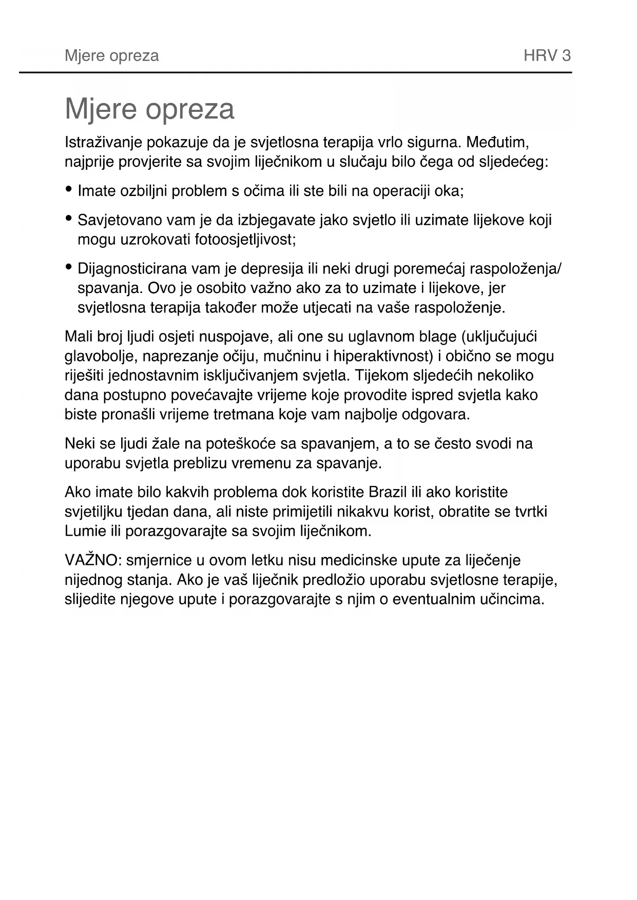 Mjere opreza4 HRV Uvod Uporaba proizvoda Brazil osigurat će vam jarku svjetlost potrebnu vašem tijelu tijekom mračnih zimskih mjeseci. Može vam pomoći u povećanju razine energije, dovesti vas u bolje raspoloženje i učiniti da se osjećate budnijima
