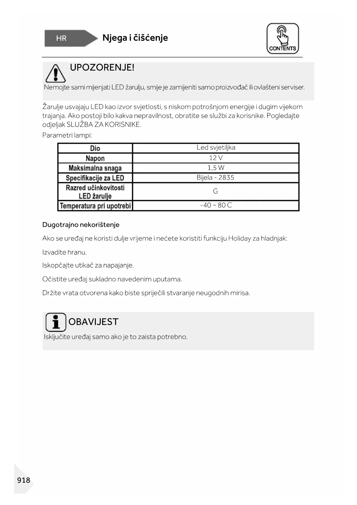 1. Kada je aktivna funkcija Holiday, u odjeljku hladnjaka ne smiju se skladištiti