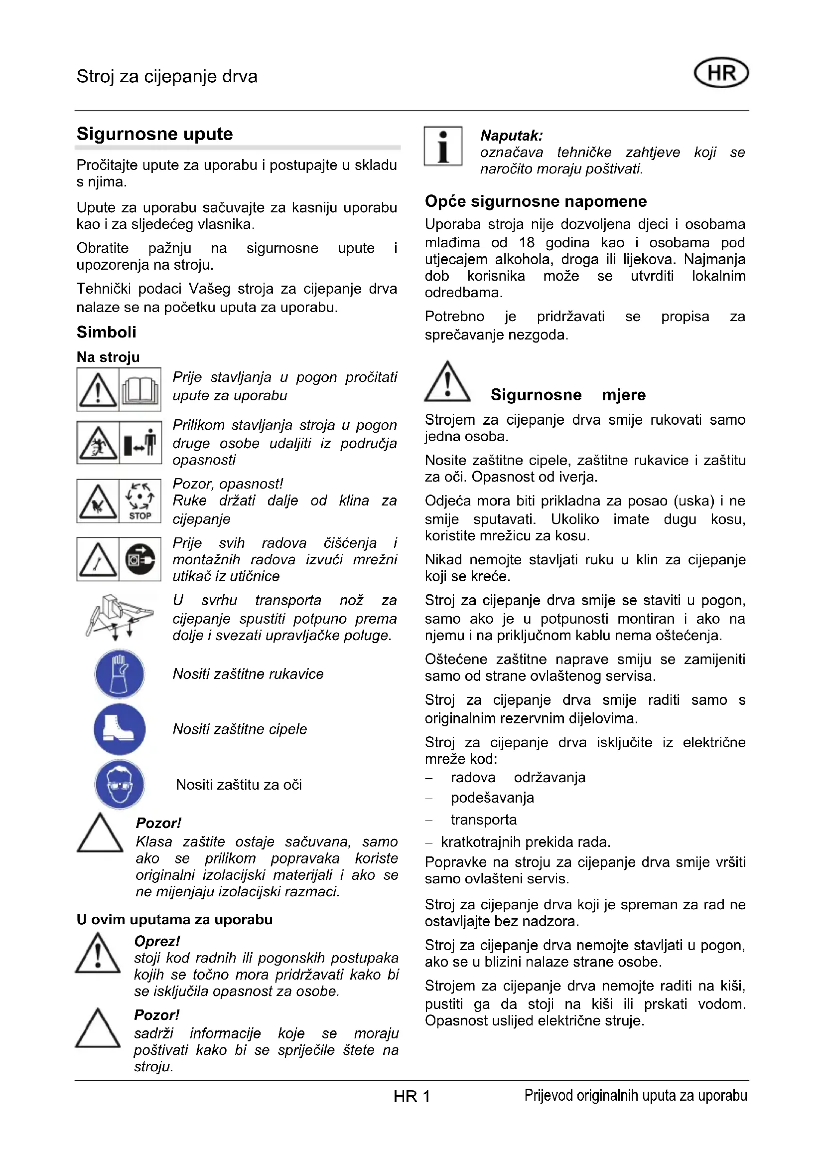 − 400 V 3~/50 Hz trofazna struja − 5-žilni mrežni priključak i priključni kabel: 3P+N+SL − najmanji poprečni presjek priključnog kabla = 2,5 mm² − osiguranje mrežnog priključka = 16 A − smjer vrtnje motora: u smjeru strelice (strelica na poklopcu ventilatora) Smjer vrtnje je potrebno provjeriti kod svakog novog strujnog priključka. Pravilna uporaba Stroj za cijepanje drva namijenjen je za privatnu uporabu u kući i vrtu. Stroj za cijepanje drva namijenjen je isključivo za sljedeće primjene: − cijepanje drva koje je upravo odrezano i ne prelazi dimenzije sukladno tehničkim podacima. Nepravilna uporaba − Zabranjeno je cijepanje drva u kojem se nalaze metalni dijelovi kao što su čavli, žica, spone itd. − Nije dopušten rad stroja u okolini u kojoj postoji opasnost od eksplozije. − Zabranjena je svaka druga uporaba stroja koja prelazi okvire pravilne uporabe. Opis stroja, slika A 1 transportna drška 2 nož za cijepanje 3 upravljačke konzole s upravljačkom polugom i zaštitom za ruke 4 stol za cijepanje 5 posuda za hidrauličko ulje 6 noge 7 motor 8 kombinacija prekidač-utikač 9 stup za cijepanje 10 okretni stol 11 poluga za uglavljivanje na okretnom stolu 12 križni element za cijepanje 13 stezne gumeStroj za cijepanje drva HR 3 Otpakiravanje/montaža Oprez! Stroj za cijepanje drva smije se koristiti tek nakon potpune montaže svih dijelova.