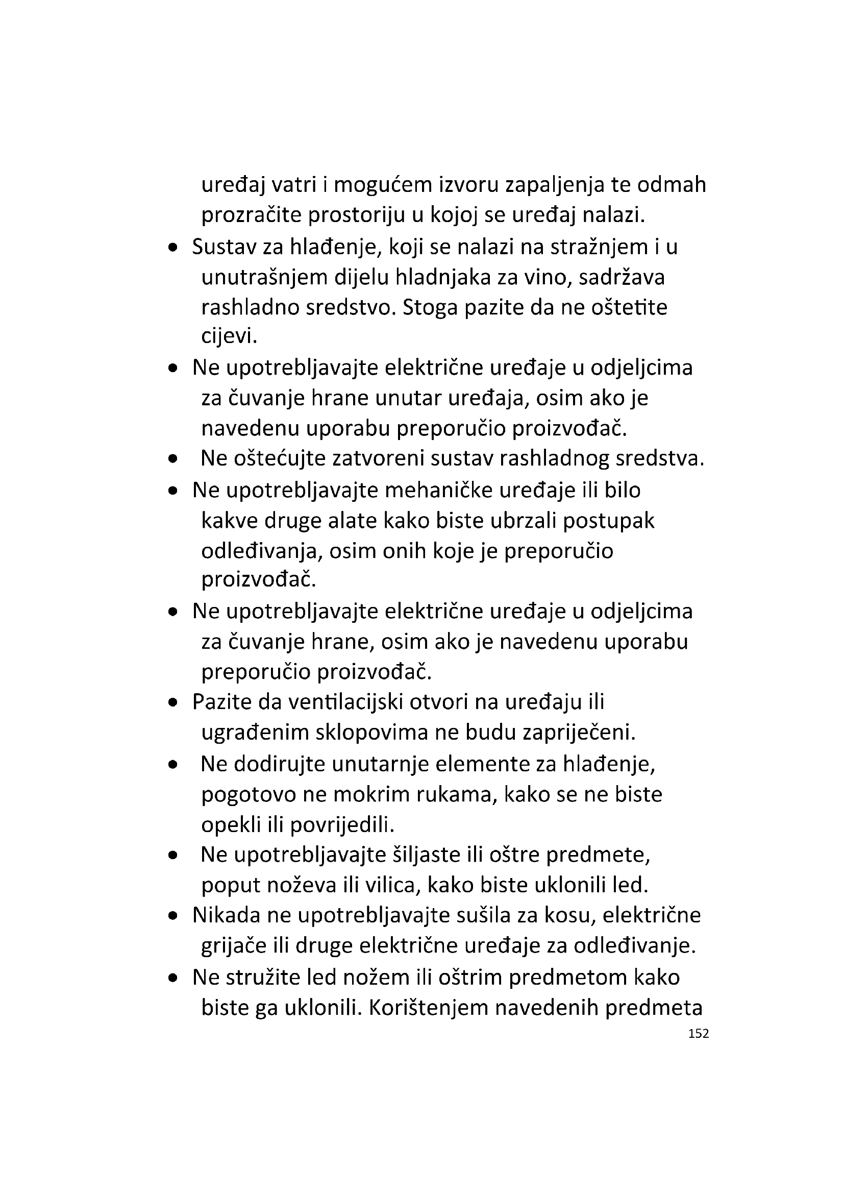 uređaj vatri i mogućem izvoru zapaljenja te odmah prozračite prostoriju u kojoj se uređaj nalazi. Sustav za hlađenje, koji se nalazi na stražnjem i u unutrašnjem dijelu hladnjaka za vino, sadržava rashladno sredstvo. Stoga pazite da ne oštetite cijevi. Ne upotrebljavajte električne uređaje u odjeljcima za čuvanje hrane unutar uređaja, osim ako je navedenu uporabu preporučio proizvođač. Ne oštećujte zatvoreni sustav rashladnog sredstva. Ne upotrebljavajte mehaničke uređaje ili bilo kakve druge alate kako biste ubrzali postupak odleđivanja, osim onih koje je preporučio proizvođač. Ne upotrebljavajte električne uređaje u odjeljcima za čuvanje hrane, osim ako je navedenu uporabu preporučio proizvođač. Pazite da ventilacijski otvori na uređaju ili ugrađenim sklopovima ne budu zapriječeni. Ne dodirujte unutarnje elemente za hlađenje, pogotovo ne mokrim rukama, kako se ne biste opekli ili povrijedili. Ne upotrebljavajte šiljaste ili oštre predmete, poput noževa ili vilica, kako biste uklonili led. Nikada ne upotrebljavajte sušila za kosu, električne grijače ili druge električne uređaje za odleđivanje. Ne stružite led nožem ili oštrim predmetom kako biste ga uklonili. Korištenjem navedenih predmeta153
