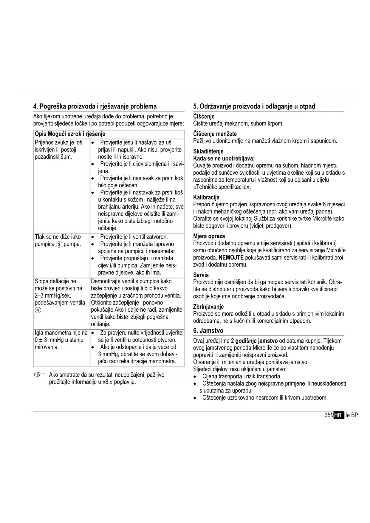 Ovaj uređaj ima 2 godišnje jamstvo od datuma kupnje. Tijekom ovog jamstvenog perioda Microlife će po vlastitom nahođenju popraviti ili zamijeniti neispravni proizvod. Otvaranje ili mijenjanje uređaja poništava jamstvo. Sljedeći dijelovi nisu uključeni u jamstvo: Cijena trasnporta i rizik transporta. Oštećenja nastala zbog neispravne primjene ili neusklađenosti s uputama za uporabu. Oštećenje uzrokovano nesrećom ili krivom upotrebom. Opis Mogući uzrok i rješenje Prijenos zvuka je loš, iskrivljen ili postoji pozadinski šum. Provjerite jesu li nastavci za uši prljavi ili napukli. Ako nisu, provjerite nosite li ih ispravno. Provjerite je li cijev slomljena ili savi- jena. Provjerite je li nastavak za prsni koš bilo gdje oštećen. Provjerite je li nastavak za prsni koš u kontaktu s kožom i naliježe li na brahijalnu arteriju. Ako ih nađete, sve neispravne dijelove očistite ili zami- jenite kako biste izbjegli netočno očitanje. Tlak se ne diže iako pumpica 3 pumpa. Provjerite je li ventil zatvoren. Provjerite je li manžeta ispravno spojena na pumpicu i manometar. Provjerite propuštaju li manžeta, cijev i/ili pumpica. Zamijenite neis- pravne dijelove, ako ih ima. Stopa deflacije ne može se postaviti na 2–3 mmHg/sek. podešavanjem ventila