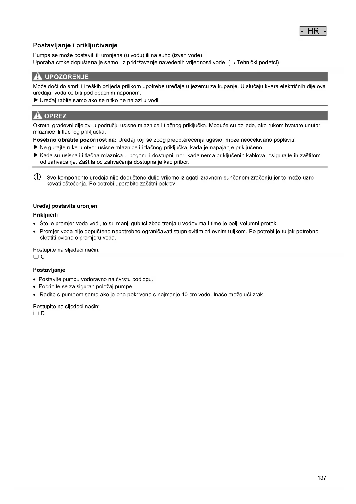 UPOZORENJE Može doći do smrti ili teških ozljeda prilikom upotrebe uređaja u jezercu za kupanje. U slučaju kvara električnih dijelova uređaja, voda će biti pod opasnim naponom. Uređaj rabite samo ako se nitko ne nalazi u vodi. OPREZ Okretni građevni dijelovi u području usisne mlaznice i tlačnog priključka. Moguće su ozljede, ako rukom hvatate unutar mlaznice ili tlačnog priključka. Posebno obratite pozornost na: Uređaj koji se zbog preopterećenja ugasio, može neočekivano poplaviti! Ne gurajte ruke u otvor usisne mlaznice ili tlačnog priključka, kada je napajanje priključeno. Kada su usisna ili tlačna mlaznica u pogonu i dostupni, npr. kada nema priključenih kablova, osigurajte ih zaštitom od zahvaćanja. Zaštita od zahvaćanja dostupna je kao pribor. Sve komponente uređaja nije dopušteno dulje vrijeme izlagati izravnom sunčanom zračenju jer to može uzro- kovati oštećenja. Po potrebi uporabite zaštitni pokrov. Uređaj postavite uronjen Priključiti