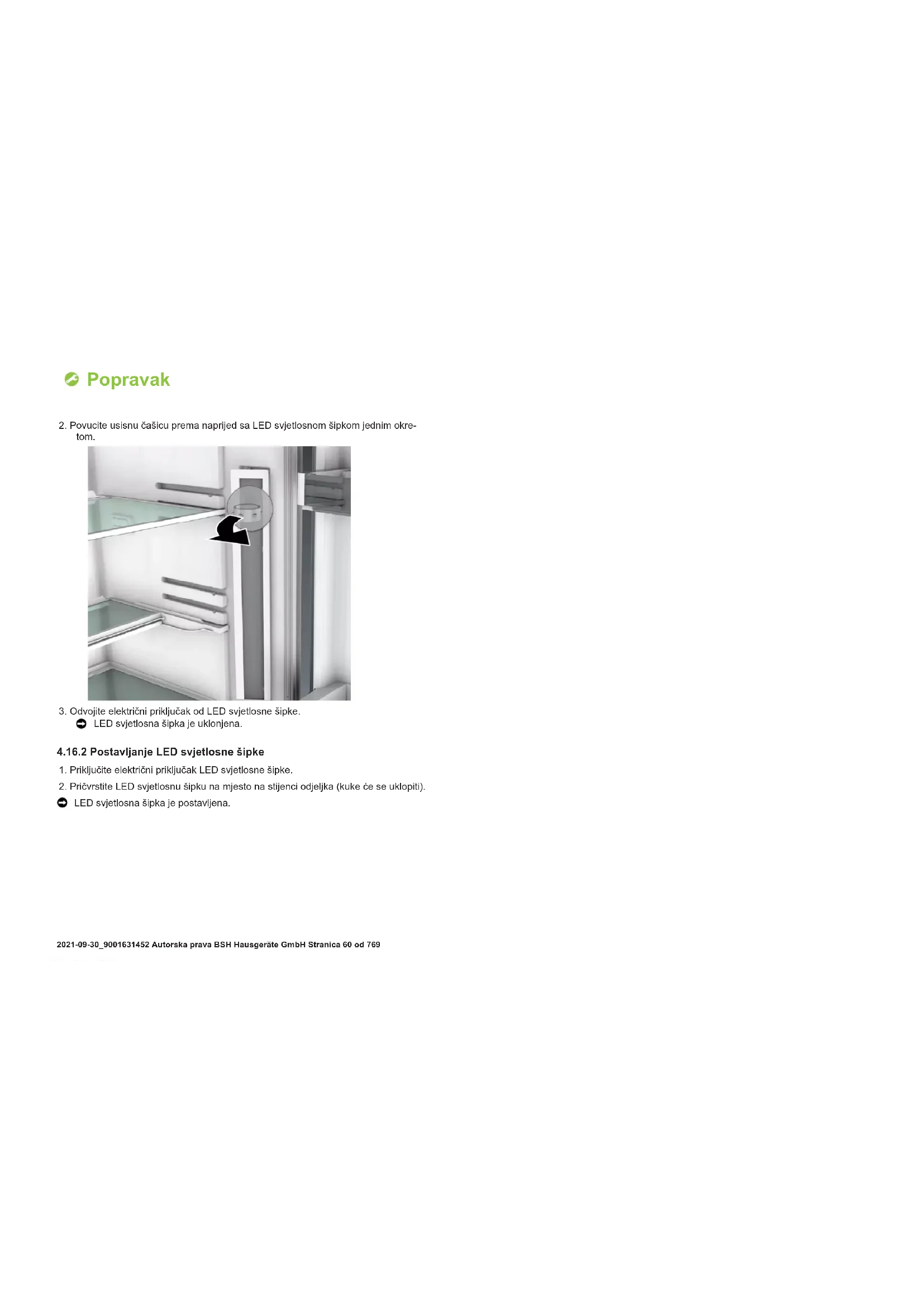 Postavite obratnim redoslijedom. Popravak 2021-09-30_9001631452 Autorska prava BSH Hausgeräte GmbH Stranica58od7694.16 Zamjena LED svjetlosne šipke Specijalni alati: Usisna čašica Ø50 mm [00342224] Uređaj ima svjetlo LED koje ne zahtijeva održavanje. Ta svjetla smije popravljati samo osoblje iz službe za korisnike ili ovlašte- ni tehničari! OPASNOST Opasnost od strujnog udara zbog dijelova koji provode struju! U slučaju nepravilnog popravka može doći do opasnosti za život od struj- nog udara