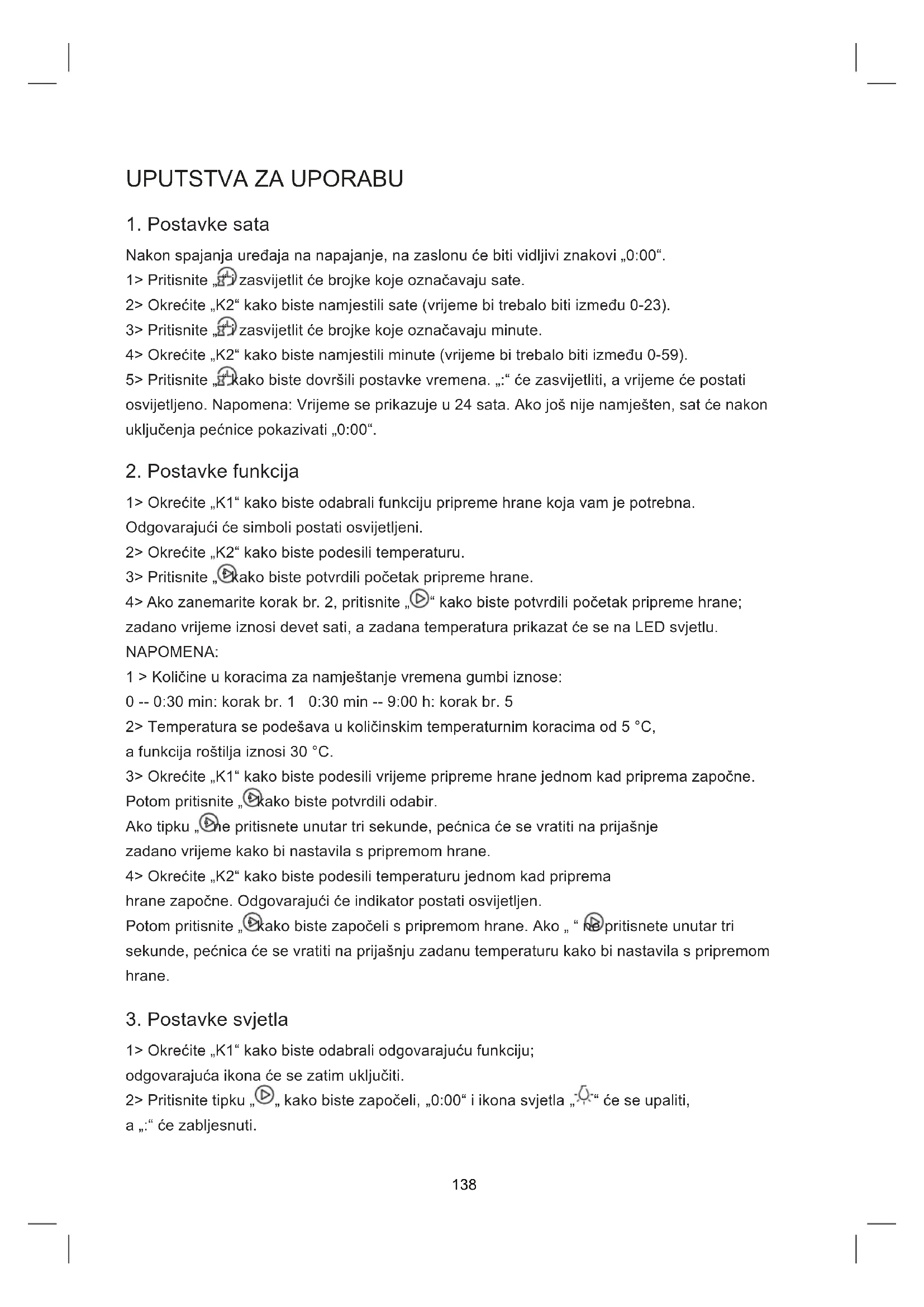 Nakon spajanja uređaja na napajanje, na zaslonu će biti vidljivi znakovi „0:00“. 1> Pritisnite „ “ i zasvijetlit će brojke koje označavaju sate. 2> Okrećite „K2“ kako biste namjestili sate (vrijeme bi trebalo biti između 0-23). 3> Pritisnite „ “ i zasvijetlit će brojke koje označavaju minute. 4> Okrećite „K2“ kako biste namjestili minute (vrijeme bi trebalo biti između 0-59). 5> Pritisnite „ “ kako biste dovršili postavke vremena. „:“ će zasvijetliti, a vrijeme će postati osvijetljeno. Napomena: Vrijeme se prikazuje u 24 sata. Ako još nije namješten, sat će nakon uključenja pećnice pokazivati „0:00“.