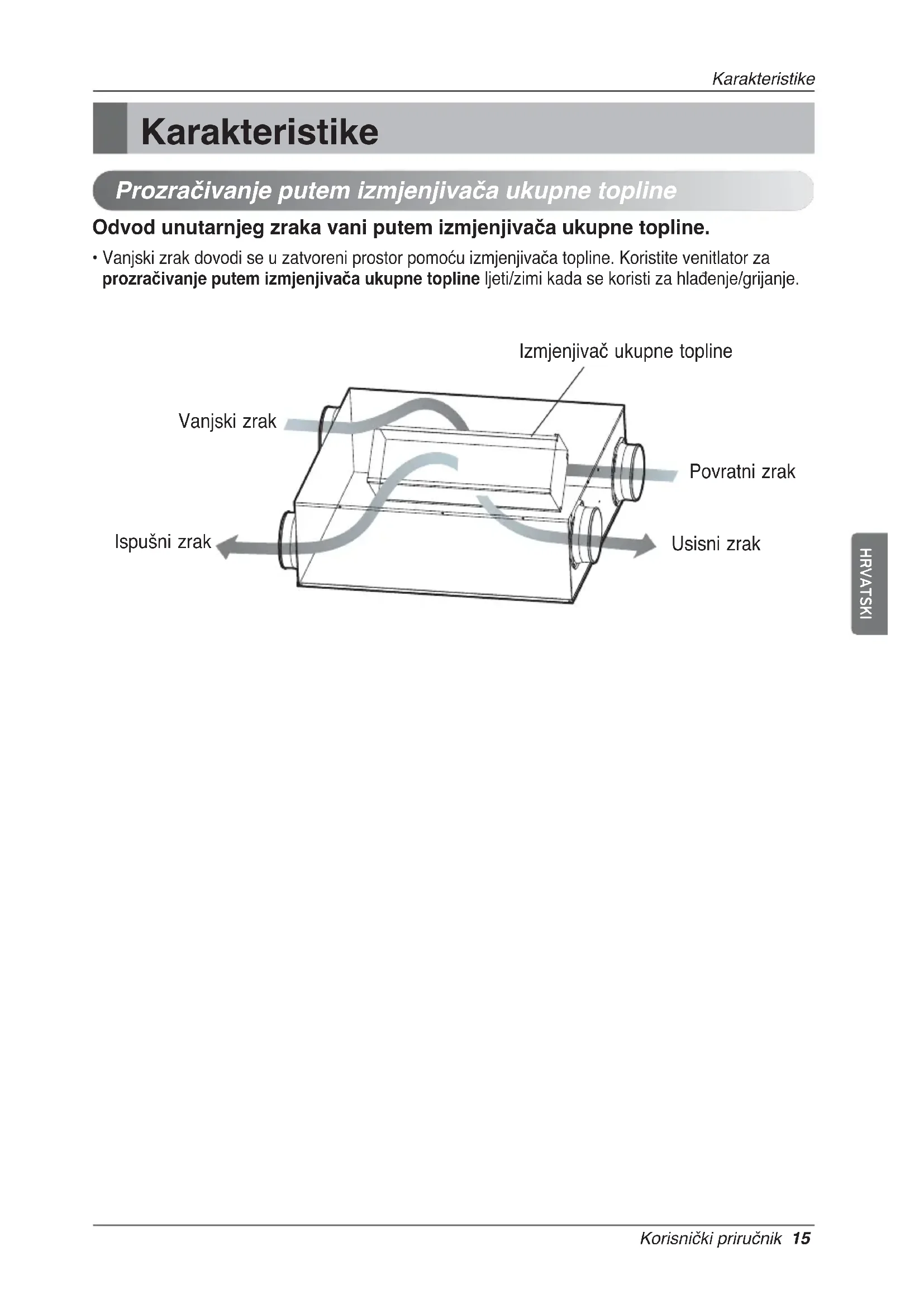 - Vanjski zrak dovodi se u zatvoreni prostor pomoću izmjenjivača topline. Koristite venitlator za prozračivanje putem izmjenjivača ukupne topline ljeti/zimi kada se koristi za hlađenje/grijanje. Prozračivanje putem izmjenjivača ukupne topline HRVATSKI16 Ventilator Karakteristike Ispušni zrak Vanjski zrak Izmjenjivač ukupne topline Prigušivač Povratni zrak Usisni zrak Ispušni zrak Vanjski zrak Izmjenjivač ukupne topline Prigušivač Povratni zrak Usisni zrak Odvod unutarnjeg zraka vani putem izmjenjivača ukupne topline.