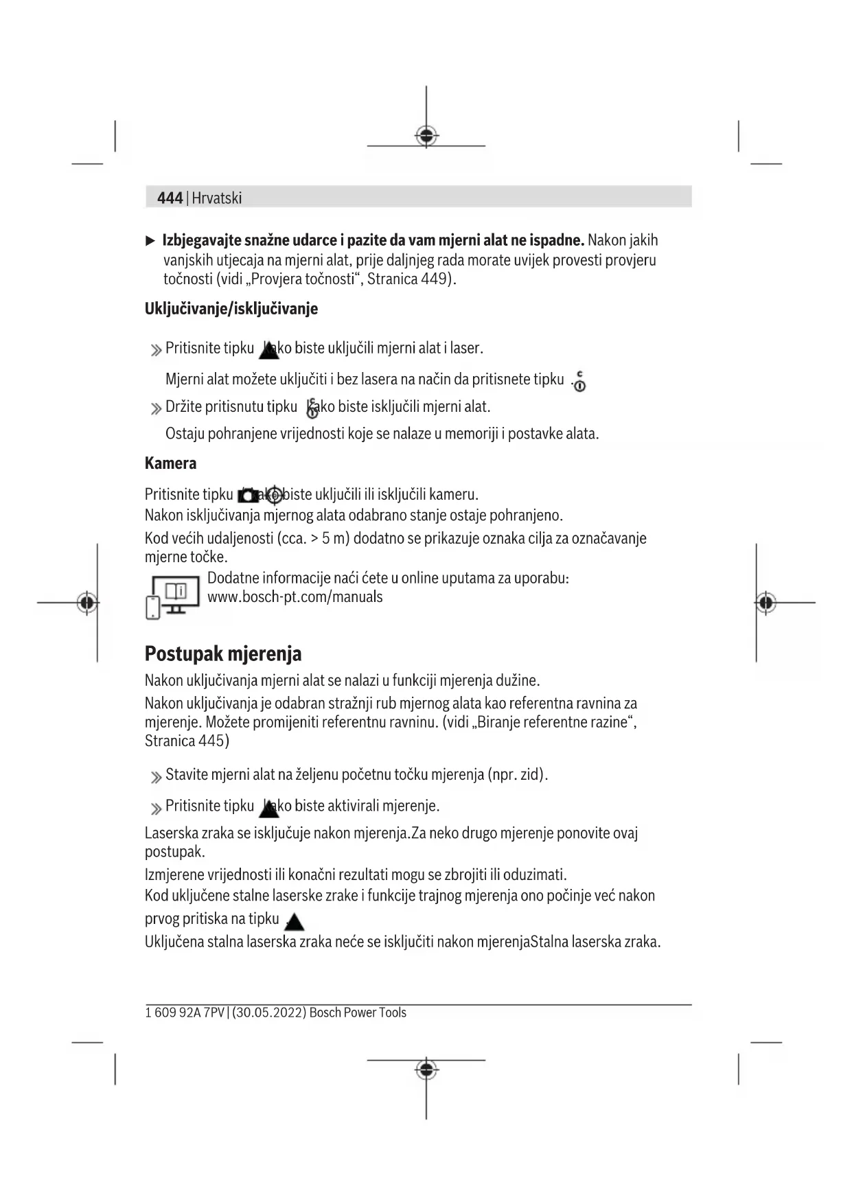 Punjenje litij-ionske aku-baterije u Za punjenje upotrebljavajte USB adapter čiji tehnički podaci (napon i struja punjenja) odgovaraju onima preporučenog adaptera. Pridržavajte se uputa za uporabu USB adaptera. Za preporučeni adapter pogledajte tehničke podatke. u Pridržavajte se mrežnog napona! Napon izvora struje mora se podudarati s podacima na tipskoj pločici utičnog adaptera. Utični adapteri označeni sa 230V mogu raditi i na 220V. Litij-ionske aku-baterije isporučuju se djelomično napunjene zbog međunarodnih propisa o prijevozu. Kako bi se zajamčio puni učinak aku-baterije, prije prve uporabe aku-bateriju napunite do kraja. Dodatne informacije naći ćete u online uputama za uporabu: www.bosch-pt.com/manuals Rad Puštanje u rad u Uključeni mjerni alat ne ostavljajte bez nadzora i isključite ga nakon uporabe. Laserska zraka bi mogla zaslijepiti ostale osobe. u Mjerni alat zaštitite od vlage i izravnog sunčevog zračenja. u Mjerni alat ne izlažite ekstremnim temperaturama ili oscilacijama temperature. Ne ostavljajte ga npr. duže vrijeme u automobilu. Mjerni alat kod većih oscilacija temperature ostavite da se temperira prije stavljanja u pogon. Kod ekstremnih temperatura ili oscilacija temperature to može se negativno utjecati na preciznost mjernog alata. Bosch Power Tools 1 609 92A 7PV | (30.05.2022)444 | Hrvatski u Izbjegavajte snažne udarce i pazite da vam mjerni alat ne ispadne. Nakon jakih vanjskih utjecaja na mjerni alat, prije daljnjeg rada morate uvijek provesti provjeru točnosti (vidi „Provjera točnosti“, Stranica449). Uključivanje/isključivanje Pritisnite tipku kako biste uključili mjerni alat i laser. Mjerni alat možete uključiti i bez lasera na način da pritisnete tipku . Držite pritisnutu tipku kako biste isključili mjerni alat. Ostaju pohranjene vrijednosti koje se nalaze u memoriji i postavke alata. Kamera Pritisnite tipku / kako biste uključili ili isključili kameru. Nakon isključivanja mjernog alata odabrano stanje ostaje pohranjeno. Kod većih udaljenosti (cca. >5m) dodatno se prikazuje oznaka cilja za označavanje mjerne točke. Dodatne informacije naći ćete u online uputama za uporabu: www.bosch-pt.com/manuals Postupak mjerenja Nakon uključivanja mjerni alat se nalazi u funkciji mjerenja dužine. Nakon uključivanja je odabran stražnji rub mjernog alata kao referentna ravnina za mjerenje. Možete promijeniti referentnu ravninu. (vidi „Biranje referentne razine“, Stranica445) Stavite mjerni alat na željenu početnu točku mjerenja (npr. zid). Pritisnite tipku kako biste aktivirali mjerenje. Laserska zraka se isključuje nakon mjerenja.Za neko drugo mjerenje ponovite ovaj postupak. Izmjerene vrijednosti ili konačni rezultati mogu se zbrojiti ili oduzimati. Kod uključene stalne laserske zrake i funkcije trajnog mjerenja ono počinje već nakon prvog pritiska na tipku . Uključena stalna laserska zraka neće se isključiti nakon mjerenjaStalna laserska zraka. 1 609 92A 7PV | (30.05.2022) Bosch Power ToolsHrvatski | 445 Dodatne informacije naći ćete u online uputama za uporabu: www.bosch-pt.com/manuals Mjerni alat se tijekom mjerenja ne smije pomicati. Stoga mjerni alat položite po mogućnosti na čvrstu graničnu površinu ili podlogu. Prijemna leća(20), izlaz laserskog zračenja(21) i kamera(22) ne smiju biti prekriveni kod mjerenja. Biranje referentne razine Za mjerenje možete birati između različitih referentnih ravnina: stražnji rub mjernog alata (npr. kod stavljanja na zidove) vrh zaustavne pločeotklopljene za 180° (npr. za mjerenja iz kutova) prednji rub mjernog alata (npr. kod mjerenja od ruba stola) sredina navoja stativa(19) (npr. za mjerenja sa stativom) Dodatne informacije naći ćete u online uputama za uporabu: www.bosch-pt.com/manuals Izbornik Osnovne postavke U izborniku Osnovne postavke možete pronaći sljedeće osnovne postavke: – Uključivanje/isključivanje Bluetooth® – Promjena referentne ravnine(vidi „Biranje referentne razine“, Stranica445) – Funkcija timera – Uključivanje/isključivanje stalne laserske zrake – Kalibriranje mjerenja nagiba(vidi „Provjera točnosti“, Stranica449) – Kalibriranje ciljnog prikaza – Brisanje memorije (GLM 150-27 C) Bosch Power Tools 1 609 92A 7PV | (30.05.2022)446 | Hrvatski – Namještanje jezika – Namještanje datuma & vremena – Promjena mjerne jedinice – Promjena jedinice kuta – Aktiviranje PRO360 – Pozivanje informacija o alatu – Uključivanje/isključivanje tonskih signala – Namještanje vremena isključivanja – Namještanje vremena zatamnjenja – Namještanje svjetline zaslona – Uključivanje/isključivanje automatskog zakretanja zaslona Kratko pritisnite tipku ili držite pritisnutu tipku kako biste otvorili izbornik Osnovne postavke . Odaberite željenu postavku pritiskom na tipku ili tipku . Pritisnite tipku kako biste potvrdili odabir. Kako biste izašli iz izbornika Osnovne postavke , pritisnite tipku ili tipku . Dodatne informacije naći ćete u online uputama za uporabu: www.bosch-pt.com/manuals Funkcije mjerenja Biranje/promjena funkcija mjerenja U izborniku Funkcije možete pronaći sljedeće funkcije: – Mjerenje dužine – Mjerenje površina – Mjerenje volumena – Neizravno mjerenje udaljenosti