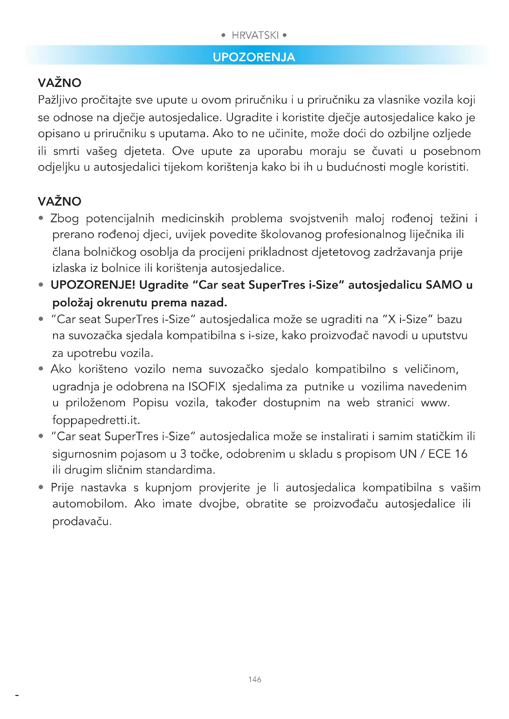 - Ako korišteno vozilo nema suvozačko sjedalo kompatibilno s veličinom, ugradnja je odobrena na ISOFIX sjedalima za putnike u vozilima navedenim u priloženom Popisu vozila, također dostupnim na web stranici www. foppapedretti.it.