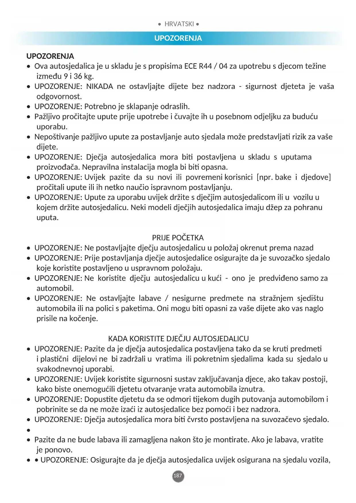 - • UPOZORENJE: Ne stavljajte ništa pod dječju autosjedalicu (npr. ručnik ili jastuk) jer to može utjeca na rad sjedala u nesreći.