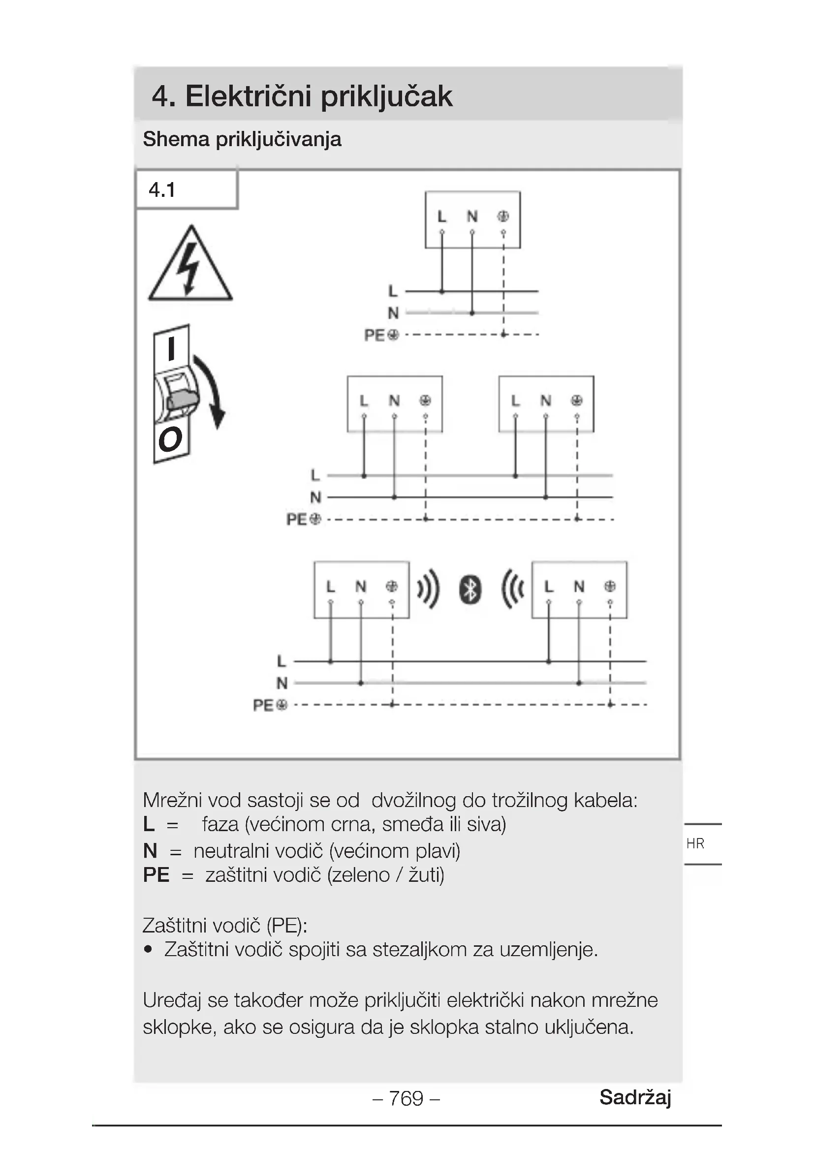 - Zaštitni vodič spojiti sa stezaljkom za uzemljenje. Uređaj se također može priključiti električki nakon mrežne sklopke, ako se osigura da je sklopka stalno uključena.– 770 – Sadržaj Izvor svjetlosti ove svjetiljke nije zamjenjiv; ako bi se morao zamijeniti (npr. na kraju njegovog vijeka trajanja), potrebno je zamijeniti cijelu svjetiljku.