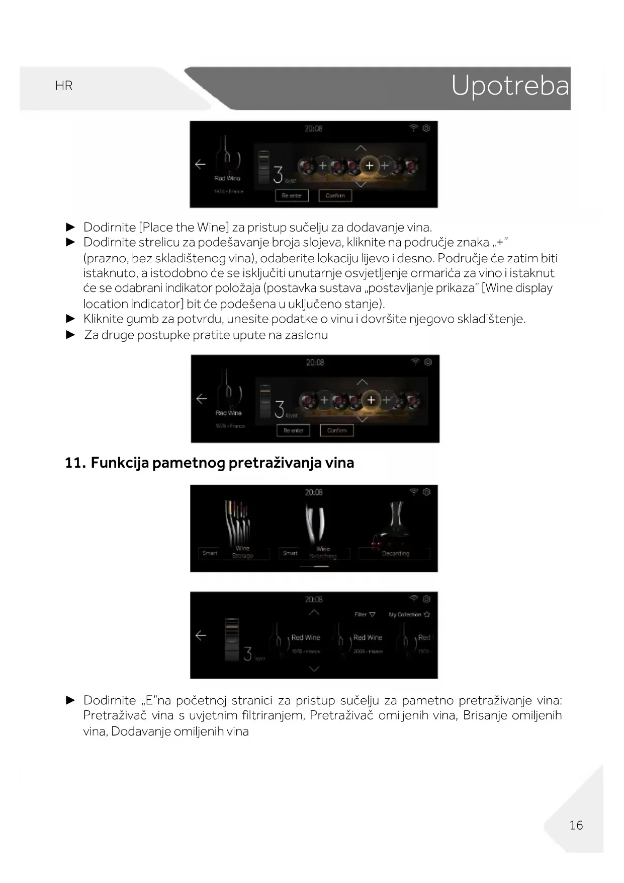 ► Dodirnite [Place the Wine] za pristup sučelju za dodavanje vina. ► Dodirnite strelicu za podešavanje broja slojeva, kliknite na područje znaka „+” (prazno, bez skladištenog vina), odaberite lokaciju lijevo i desno. Područje će zatim biti istaknuto, a istodobno će se isključiti unutarnje osvjetljenje ormarića za vino i istaknut će se odabrani indikator položaja (postavka sustava „postavljanje prikaza” [Wine display location indicator] bit će podešena u uključeno stanje). ► Kliknite gumb za potvrdu, unesite podatke o vinu i dovršite njegovo skladištenje. ► Za druge postupke pratite upute na zaslonu
