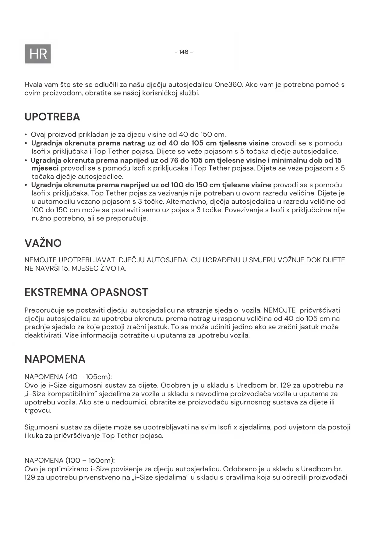 - Ugradnja okrenuta prema naprijed uz od 100 do 150 cm tjelesne visine provodi se s pomoću Isofi x priključaka. Top Tether pojas za vezivanje nije potreban u ovom razredu veličine. Dijete je u automobilu vezano pojasom s 3 točke. Alternativno, dječja autosjedalica u razredu veličine od 100 do 150 cm može se postaviti samo uz pojas s 3 točke. Povezivanje s Isofi x priključcima nije nužno potrebno, ali se preporučuje. VAŽNO NEMOJTE UPOTREBLJAVATI DJEČJU AUTOSJEDALCU UGRAĐENU U SMJERU VOŽNJE DOK DIJETE NE NAVRŠI 15.MJESEC ŽIVOTA. EKSTREMNA OPASNOST Preporučuje se postaviti dječju autosjedalicu na stražnje sjedalo vozila. NEMOJTE pričvršćivati dječju autosjedalicu za upotrebu okrenutu prema natrag u rasponu veličina od 40 do 105 cm na prednje sjedalo za koje postoji zračni jastuk. To se može učiniti jedino ako se zračni jastuk može deaktivirati. Više informacija potražite u uputama za upotrebu vozila. NAPOMENA NAPOMENA (40 – 105cm): Ovo je i-Size sigurnosni sustav za dijete. Odobren je u skladu s Uredbom br. 129 za upotrebu na „i-Size kompatibilnim” sjedalima za vozila u skladu s navodima proizvođača vozila u uputama za upotrebu vozila. Ako ste u nedoumici, obratite se proizvođaču sigurnosnog sustava za dijete ili trgovcu. Sigurnosni sustav za dijete može se upotrebljavati na svim Isofi x sjedalima, pod uvjetom da postoji i kuka za pričvršćivanje Top Tether pojasa. NAPOMENA (100 – 150cm): Ovo je optimizirano i-Size povišenje za dječju autosjedalicu. Odobreno je u skladu s Uredbom br. 129 za upotrebu prvenstveno na „i-Size sjedalima” u skladu s pravilima koja su odredili proizvođači- 147 -