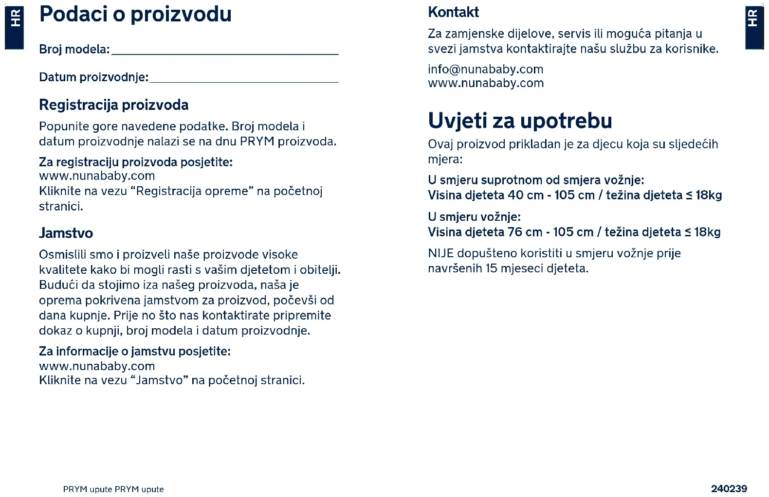 Čišćenje i održavanje Nakon uklanjanja pričvrsnih krilca s umetka pohranite ih izvan dohvata djeteta. Donji jastučić sjedala i gornji pokrov sjedala perite hladnom vodom na temperaturi nižoj od 30 °C. Ne glačajte meke dijelove. Ne izbijeljujte niti nemojte kemijski čistiti meke dijelove. Ne koristite nerazrijeđene deterdžente, benzin ili druga organska otapala za pranje napredne dječje autosjedalice. To može oštetiti proizvod. Koristite samo blage deterdžente, vodu i meku krpu za čišćenje školjke napredne dječje autosjedalice i traka sigurnosnih pojaseva. Ne uvijajte meke dijelove velikom silom radi iscjeđivanja i sušenja. To može izgužvati meke dijelove i ostaviti nabore. Meke dijelove objesite i sušite u hladu. Uklonite naprednu dječju auto-sjedalicu sa sjedala u vozilu ako se neće dulje vrijeme koristiti. Stavite naprednu dječju autosjedalicu na hladno i suho mjesto izvan dohvata djece. NUNA International B.V. Nuna i svi pridruženi logotipi su zaštitni znaci.262261 Navodila za izdelek PRYM Navodila za izdelek PRYM