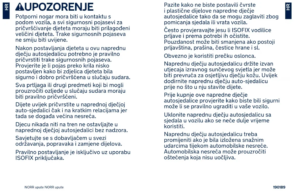 HRNapredna dječja autosjedalica mora se koristiti isključivo s oblogama i dodatnom opremom istog proizvođača. Obloge su sastavni dio napredne dječje autosjedalice i potrebne su radi sigurnosti djeteta. NE KORISTITE naprednu dječju autosjedalicu okrenutu obrnuto od smjera vožnje ako je aktiviran prednji zračni jastuk. Moguće su ozbiljne ozljede ili smrt. NE VRŠITE nikakve preinake niti što dodajte na proizvod bez izričitog pisanog odobrenja nadležnog tijela. Korisnik se treba strogo pridržavati uputa o postavljanju koje navodi i isporučuje proizvođač napredne dječje autosjedalice. NE KORISTITE ovu naprednu dječju autosjedalicu ako je oštećena ili joj nedostaju dijelovi. NE ODIJEVAJTE djetetu odjeću koja je za njega prevelika jer će to onemogućiti pravilno pritezanje traka sigurnosnih pojaseva za ramena i pričvrsnog remena između nogu. NE STAVLJAJTE nikakve predmete u područje potpornog nogara ispred baze napredne dječje autosjedalice. NIKAD ne koristite druge kontaktne točke za opterećenje i nošenje osim onih navedenih u uputama i označenih na autosjedalici bez naslona. NIKAD NE koristite naprednu dječju autosjedalicu iz druge ruke ili onu za koju ne znate kako se koristila jer može imati strukturna oštećenja koja ugrožavaju djetetovu sigurnost. NIKAD NE koristite užad ili druge zamjene za pričvršćivanje napredne dječje autosjedalice u vozilo ili za učvršćivanje djeteta u njoj. Dječja autosjedalica možda se neće moći postaviti u sva odobrena vozila kad se koristi u jednom od tih položaja.