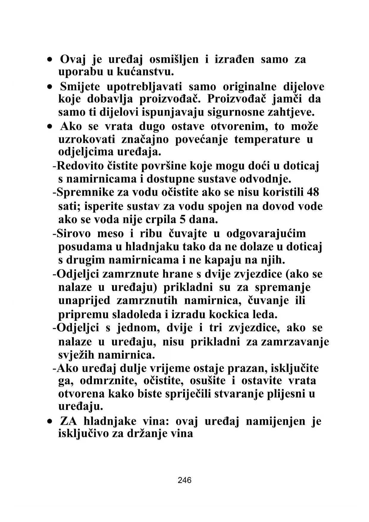 - Ako se vrata dugo ostave otvorenim, to može uzrokovati značajno povećanje temperature u odjeljcima uređaja. -Redovito čistite površine koje mogu doći u doticaj s namirnicama i dostupne sustave odvodnje. -Spremnike za vodu očistite ako se nisu koristili 48 sati; isperite sustav za vodu spojen na dovod vode ako se voda nije crpila 5 dana. -Sirovo meso i ribu čuvajte u odgovarajućim posudama u hladnjaku tako da ne dolaze u doticaj s drugim namirnicama i ne kapaju na njih. -Odjeljci zamrznute hrane s dvije zvjezdice (ako se nalaze u uređaju) prikladni su za spremanje unaprijed zamrznutih namirnica, čuvanje ili pripremu sladoleda i izradu kockica leda. -Odjeljci s jednom, dvije i tri zvjezdice, ako se nalaze u uređaju, nisu prikladni za zamrzavanje svježih namirnica. -Ako uređaj dulje vrijeme ostaje prazan, isključite ga, odmrznite, očistite, osušite i ostavite vrata otvorena kako biste spriječili stvaranje plijesni u uređaju.