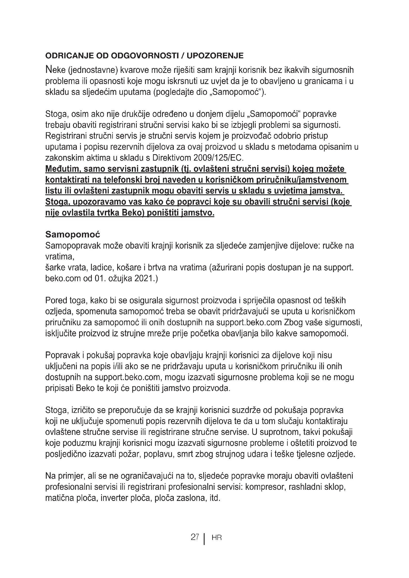 Neke (jednostavne) kvarove može riješiti sam krajnji korisnik bez ikakvih sigurnosnih problema ili opasnosti koje mogu iskrsnuti uz uvjet da je to obavljeno u granicama i u skladu sa sljedećim uputama (pogledajte dio „Samopomoć“). Stoga, osim ako nije drukčije određeno u donjem dijelu „Samopomoći“ popravke trebaju obaviti registrirani stručni servisi kako bi se izbjegli problemi sa sigurnosti. Registrirani stručni servis je stručni servis kojem je proizvođač odobrio pristup uputama i popisu rezervnih dijelova za ovaj proizvod u skladu s metodama opisanim u zakonskim aktima u skladu s Direktivom 2009/125/EC. Međutim, samo servisni zastupnik (tj. ovlašteni stručni servisi) kojeg možete kontaktirati na telefonski broj naveden u korisničkom priručniku/jamstvenom listu ili ovlašteni zastupnik mogu obaviti servis u skladu s uvjetima jamstva. Stoga, upozoravamo vas kako će popravci koje su obavili stručni servisi (koje nije ovlastila tvrtka Beko) poništiti jamstvo. Samopomoć Samopopravak može obaviti krajnji korisnik za sljedeće zamjenjive dijelove: ručke na vratima, šarke vrata, ladice, košare i brtva na vratima (ažurirani popis dostupan je na support. beko.com od 01. ožujka 2021.) Pored toga, kako bi se osigurala sigurnost proizvoda i spriječila opasnost od teških ozljeda, spomenuta samopomoć treba se obavit pridržavajući se uputa u korisničkom priručniku za samopomoć ili onih dostupnih na support.beko.com Zbog vaše sigurnosti, isključite proizvod iz strujne mreže prije početka obavljanja bilo kakve samopomoći. Popravak i pokušaj popravka koje obavljaju krajnji korisnici za dijelove koji nisu uključeni na popis i/ili ako se ne pridržavaju uputa u korisničkom priručniku ili onih dostupnih na support.beko.com, mogu izazvati sigurnosne problema koji se ne mogu pripisati Beko te koji će poništiti jamstvo proizvoda. Stoga, izričito se preporučuje da se krajnji korisnici suzdrže od pokušaja popravka koji ne uključuje spomenuti popis rezervnih dijelova te da u tom slučaju kontaktiraju ovlaštene stručne servise ili registrirane stručne servise. U suprotnom, takvi pokušaji koje poduzmu krajnji korisnici mogu izazvati sigurnosne probleme i oštetiti proizvod te posljedično izazvati požar, poplavu, smrt zbog strujnog udara i teške tjelesne ozljede. Na primjer, ali se ne ograničavajući na to, sljedeće popravke moraju obaviti ovlašteni profesionalni servisi ili registrirani profesionalni servisi: kompresor, rashladni sklop, matična ploča, inverter ploča, ploča zaslona, itd.HR