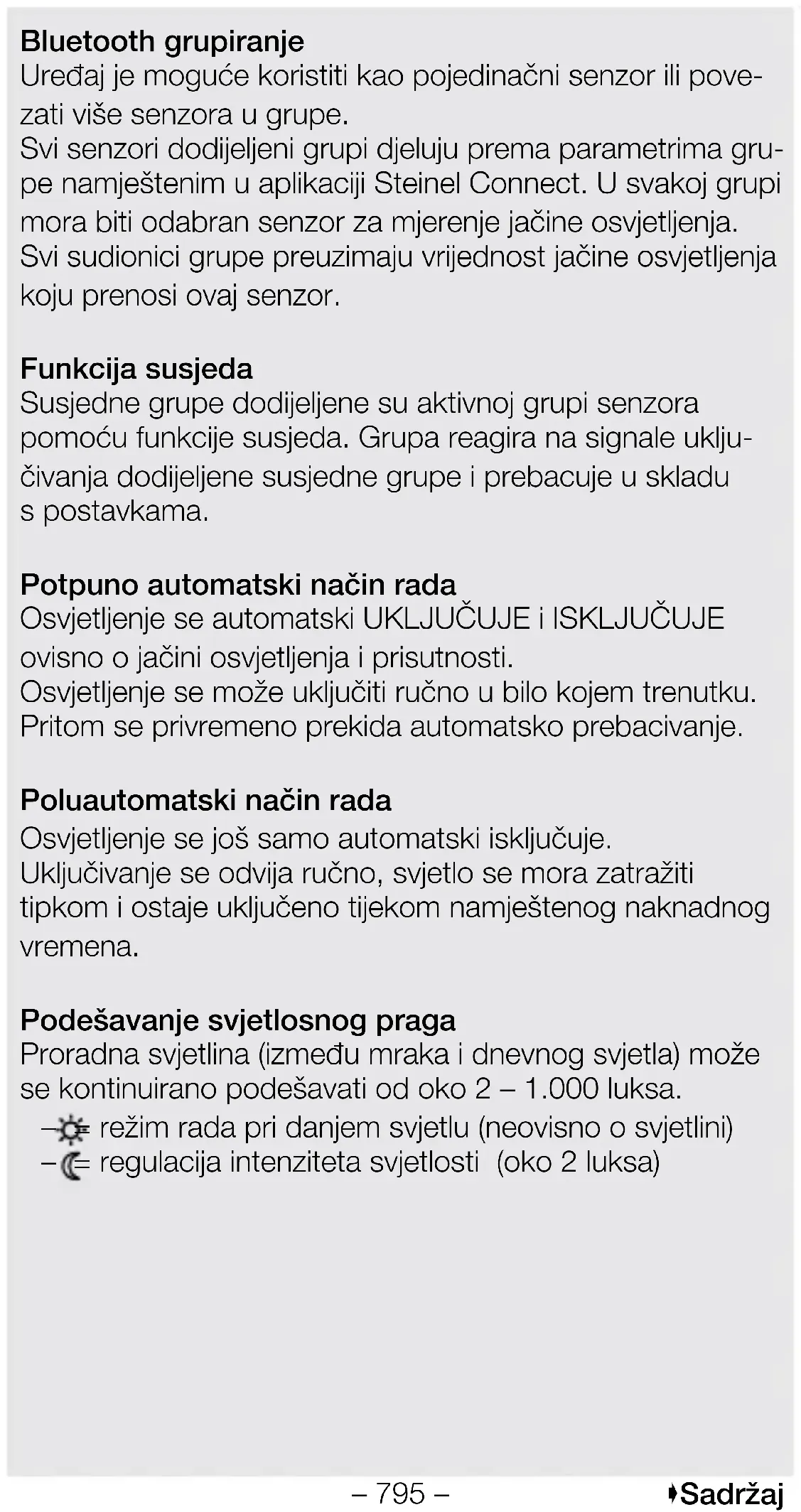 Tvorničkepostavke (prije puštanja u rad putem aplikacije Steinel Connect) – Potpuno automatski način rada / poluautomatski način rada: potpuno automatski način rada – Namještanje vremena za glavno svjetlo: 5 minuta – Osnovno svjetlo: isključeno – Referentna vrijednost jačine osvjetljenja: interno – Regulacija konstantnog svjetla: aktivirana – Regulacijski prag konstantnog svjetla: 500lx Tvorničke postavke se aktiviraju: – Pri prvom puštanju u rad detektora prisutnosti. – Pri resetiranju putem aplikacije.– 794 – Sadržaj AplikacijaSteinelConnect Za konguraciju senzora pomoću pametnog telefona ili tableta morate preuzeti aplikaciju STEINEL Connect iz svoje trgovine AppStore. Potreban je pametni telefon ili tablet sBluetoothom. Android iOS Bluetoothumrežavanje(Bluetoothmreža) Senzor odgovara standardu Bluetooth mreže. Može se umrežiti sa svim proizvodima koji odgovaraju standardu Bluetooth mreže. Senzor se kongurira pomoću aplikacije Steinel Connect. Pri prvom povezivanju senzora i aplikacije Steinel Connect, odgovarajući mrežni ključevi spremaju se na pametni telefon ili tablet. Mrežni ključ sprječava neovla- šteni pristup senzoru. Mrežni ključ mora se dijeliti za pristup putem drugog pametnog telefona ili tableta. Funkcija LED diode Inicijalizacija: LED dioda svijetli 10 sekundi. Identikacija: LED dioda treperi svake sekunde. Normalni rad: LED dioda isključena. Probni test kretanja: LED dioda svijetli. Probni test bez kretanja: LED dioda isključena.– 795 – Sadržaj Bluetooth grupiranje Uređaj je moguće koristiti kao pojedinačni senzor ili pove- zati više senzora u grupe. Svi senzori dodijeljeni grupi djeluju prema parametrima gru- pe namještenim u aplikaciji Steinel Connect. U svakoj grupi mora biti odabran senzor za mjerenje jačine osvjetljenja. Svi sudionici grupe preuzimaju vrijednost jačine osvjetljenja koju prenosi ovaj senzor. Funkcija susjeda Susjedne grupe dodijeljene su aktivnoj grupi senzora pomoću funkcije susjeda. Grupa reagira na signale uklju- čivanja dodijeljene susjedne grupe i prebacuje u skladu spostavkama. Potpunoautomatskinačinrada Osvjetljenje se automatski UKLJUČUJE i ISKLJUČUJE ovisno o jačini osvjetljenja i prisutnosti. Osvjetljenje se može uključiti ručno u bilo kojem trenutku. Pritom se privremeno prekida automatsko prebacivanje. Poluautomatskinačinrada Osvjetljenje se još samo automatski isključuje. Uključivanje se odvija ručno, svjetlo se mora zatražiti tipkom i ostaje uključeno tijekom namještenog naknadnog vremena. Podešavanjesvjetlosnogpraga Proradna svjetlina (između mraka i dnevnog svjetla) može se kontinuirano podešavati od oko 2 – 1.000luksa. – = režim rada pri danjem svjetlu (neovisno o svjetlini) – = regulacija intenziteta svjetlosti (oko 2luksa)– 796 – Sadržaj Dnevni rad Dnevni rad pokreće se postavljanjem postavke za sumrak na maksimum. U dnevnom radu senzor uključuje osvjet- ljenje neovisno o jačini osvjetljenja okoline ako se otkrije kretanje. Teach Pomoću funkcije Teach, postavka za sumrak ili zadana vrijednost za regulaciju konstantnog svjetla može se automatski namjestiti na temelju izmjerenih svjetlosnih uvjeta. Kad je regulacija konstantnog svjetla deaktivirana, postavka za sumrak postavlja se na aktualno izmjerenu vrijednost za jačinu osvjetljenja okoline. Stoga se svjetlo automatski isključuje tijekom postupka. Ako je regulacija konstantnog svjetla aktivna i svjetlo je uključeno, zadana se vrijednost za regulaciju umjesto toga postavlja na izmjerenu vrijednost svjetla. Potrebno je unaprijed ručno prigušiti svjetlo kako bi se zadana vrijednost postigla što preciznije. Također postoji mogućnost provedbe funkcije Teach uodređeno vrijeme. Regulacija konstantnog svjetla Ako je aktivirana ova funkcija, osvjetljenje se regulira na konstantnu zadanu jačinu osvjetljenja. Zadana jačina osvjetljenja odgovara ili namještenom pragu detekcije automatske regulacije jačine osvjetljenja ili vrijednosti svjetlapostavljenoj putem funkcije Teach.– 797 – Sadržaj Glavno svjetlo Postavke u glavnom svjetlu deniraju ponašanje uključiva- nja osvjetljenja kad je otkrivena prisutnost neke osobe. Kad je regulacija konstantnog svjetla deaktivirana, potrebna svjetlosna snaga postavlja se preko razine prigušenja. Kad je regulacija konstantnog svjetla aktivirana, osvjetljenje se regulira na namještenu zadanu jačinu osvjetljenja. Minimalna svjetlosna snaga ispod koje regulator ne smije pasti postavlja se preko razine prigušenja. Ako je oda- brano0 %, regulator može potpuno isključiti osvjetljenje ako ima dovoljno dnevnog svjetla. Ako se zadana jačina osvjetljenja ponovno ne postigne, regulator automatski ponovno uključuje osvjetljenje. Željeno trajanje osvjetljenja glavnog svjetla može se namje- stiti putem naknadnog vremena. Svako registrirano kretanje prije isteka ovog vremena ponovno pokreće naknadno vrijeme. Pomoću razdoblja nestajanja može se namjestiti krivulja prigušenja pri uključivanju i isključivanju. Osnovno svjetlo Postavke u osnovnom svjetlu deniraju ponašanje nakon što je otkazano glavno svjetlo nakon isteka naknadnog vremena, u slučaju odsutnosti. Ponovno se prebacuje u status glavnog svjetla ako se tijekom statusa osnovnog svjetla otkrije kretanje. Osnovno svjetlo može se deaktivirati ili kongurirati s funk- cijama koje se temelje na jačini osvjetljenja ili vremenu. Kad je deaktivirano osnovno svjetlo, osvjetljenje se isklju- čuje odmah nakon isteka naknadnog vremena glavnog svjetla. Ne izvršava se status osnovnog svjetla.– 798 – Sadržaj Funkcija koja se temelji na jačini osvjetljenja: Ako je aktivirana funkcija koja se temelji na jačini osvjetlje- nja, status osnovnog svjetla više se ne otkazuje u slučaju odsutnosti. Željena svjetlosna snaga za osnovno svjetlo postavlja se srazinom prigušenja. Ako udio dnevne svjetlosti premaši prag detekcije, osnovno se svjetlo isključuje. Ako udio dnevne svjetlosti ne pos