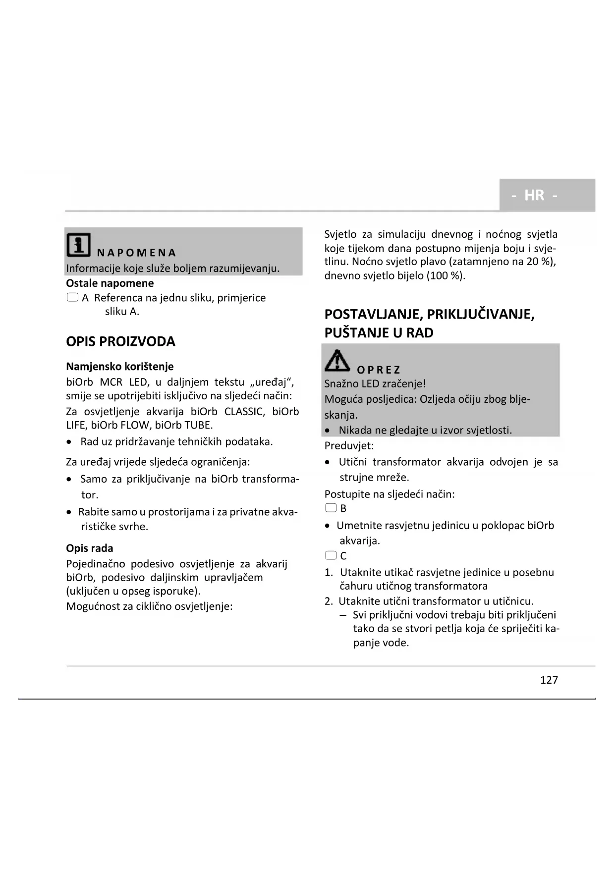NAPOMENA Informacije koje služe boljem razumijevanju. Ostale napomene A Referenca na jednu sliku, primjerice sliku A. OPIS PROIZVODA Namjensko korištenje biOrb MCR LED, u daljnjem tekstu „uređaj“, smije se upotrijebiti isključivo na sljedeći način: Za osvjetljenje akvarija biOrb CLASSIC, biOrb LIFE, biOrb FLOW, biOrb TUBE.
