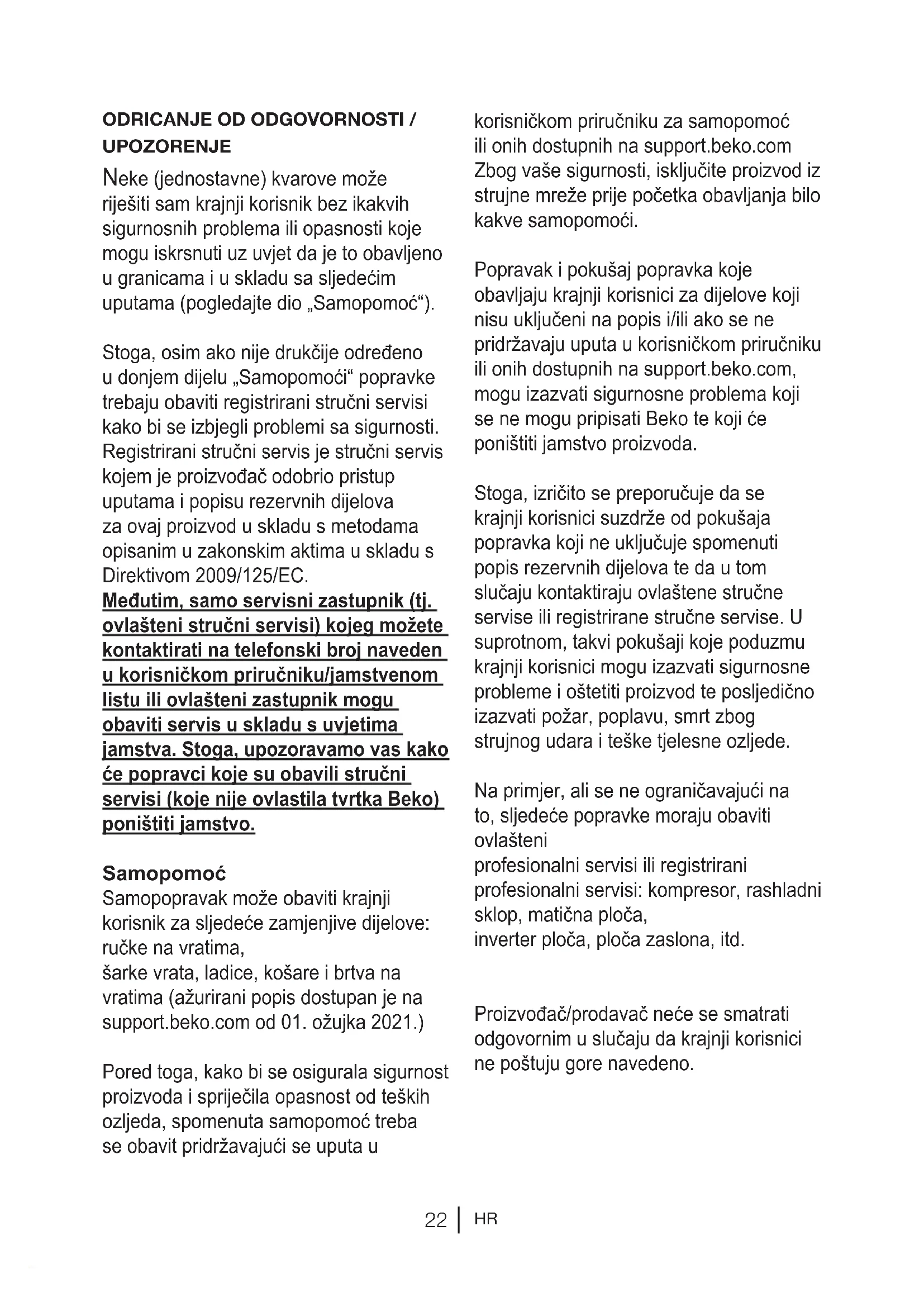 UPOZORENJE Neke (jednostavne) kvarove može riješiti sam krajnji korisnik bez ikakvih sigurnosnih problema ili opasnosti koje mogu iskrsnuti uz uvjet da je to obavljeno u granicama i u skladu sa sljedećim uputama (pogledajte dio „Samopomoć“). Stoga, osim ako nije drukčije određeno u donjem dijelu „Samopomoći“ popravke trebaju obaviti registrirani stručni servisi kako bi se izbjegli problemi sa sigurnosti. Registrirani stručni servis je stručni servis kojem je proizvođač odobrio pristup uputama i popisu rezervnih dijelova za ovaj proizvod u skladu s metodama opisanim u zakonskim aktima u skladu s Direktivom 2009/125/EC. Međutim, samo servisni zastupnik (tj. ovlašteni stručni servisi) kojeg možete kontaktirati na telefonski broj naveden u korisničkom priručniku/jamstvenom listu ili ovlašteni zastupnik mogu obaviti servis u skladu s uvjetima jamstva. Stoga, upozoravamo vas kako će popravci koje su obavili stručni servisi (koje nije ovlastila tvrtka Beko) poništiti jamstvo. Samopomoć Samopopravak može obaviti krajnji korisnik za sljedeće zamjenjive dijelove: ručke na vratima, šarke vrata, ladice, košare i brtva na vratima (ažurirani popis dostupan je na support.beko.com od 01. ožujka 2021.) Pored toga, kako bi se osigurala sigurnost proizvoda i spriječila opasnost od teških ozljeda, spomenuta samopomoć treba se obavit pridržavajući se uputa u korisničkom priručniku za samopomoć ili onih dostupnih na support.beko.com Zbog vaše sigurnosti, isključite proizvod iz strujne mreže prije početka obavljanja bilo kakve samopomoći. Popravak i pokušaj popravka koje obavljaju krajnji korisnici za dijelove koji nisu uključeni na popis i/ili ako se ne pridržavaju uputa u korisničkom priručniku ili onih dostupnih na support.beko.com, mogu izazvati sigurnosne problema koji se ne mogu pripisati Beko te koji će poništiti jamstvo proizvoda. Stoga, izričito se preporučuje da se krajnji korisnici suzdrže od pokušaja popravka koji ne uključuje spomenuti popis rezervnih dijelova te da u tom slučaju kontaktiraju ovlaštene stručne servise ili registrirane stručne servise. U suprotnom, takvi pokušaji koje poduzmu krajnji korisnici mogu izazvati sigurnosne probleme i oštetiti proizvod te posljedično izazvati požar, poplavu, smrt zbog strujnog udara i teške tjelesne ozljede. Na primjer, ali se ne ograničavajući na to, sljedeće popravke moraju obaviti ovlašteni profesionalni servisi ili registrirani profesionalni servisi: kompresor, rashladni sklop, matična ploča, inverter ploča, ploča zaslona, itd. Proizvođač/prodavač neće se smatrati odgovornim u slučaju da krajnji korisnici ne poštuju gore navedeno.HR