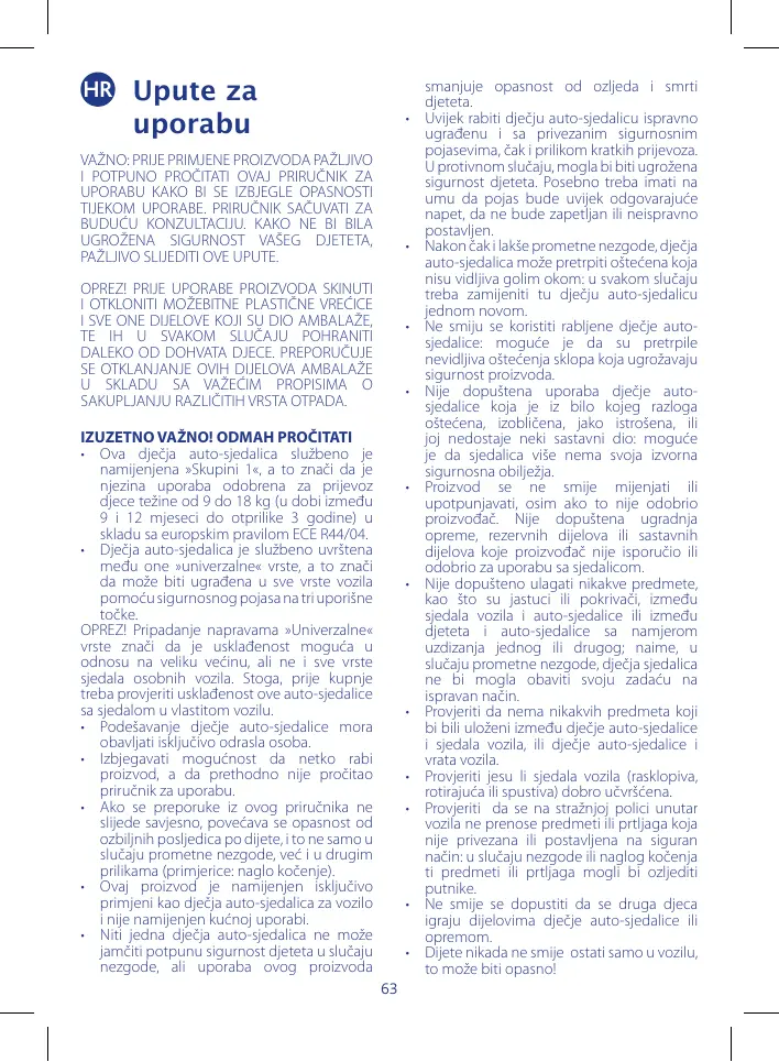 • Ce siège-auto est homologué “Universel” et peut donc être installé sur la quasi totalité des véhicules en l’accrochant à l’aide de la ceinture à trois points du siège de la voiture. ATTENTION ! “Universel” signifie qu’il est compatible avec la plupart des véhicules – ce qui ne signifie pas tous les véhicules. Il faut donc vérifier la compatibilité du siège-auto avec votre voiture avant l’achat. • Le réglage du siège-auto doit être fait uniquement par un adulte. • Ne pas utiliser ce produit sans avoir préalablement lu les instructions. • Le risque de dommages graves pour l’enfant augmente si les indications de cette notice ne sont pas suivies scrupuleusement. Ce risque n’intervient pas uniquement en cas d’accident, mais aussi dans d’autres situations (ex. freinages brusques, etc.). • Le produit est exclusivement destiné à servir de siège-auto. Il n’est pas prévu pour une utilisation à la maison, ou aucune autre utilisation. • Aucun siège-auto ne peut garantir la sécurité totale de l’enfant en cas d’accident,