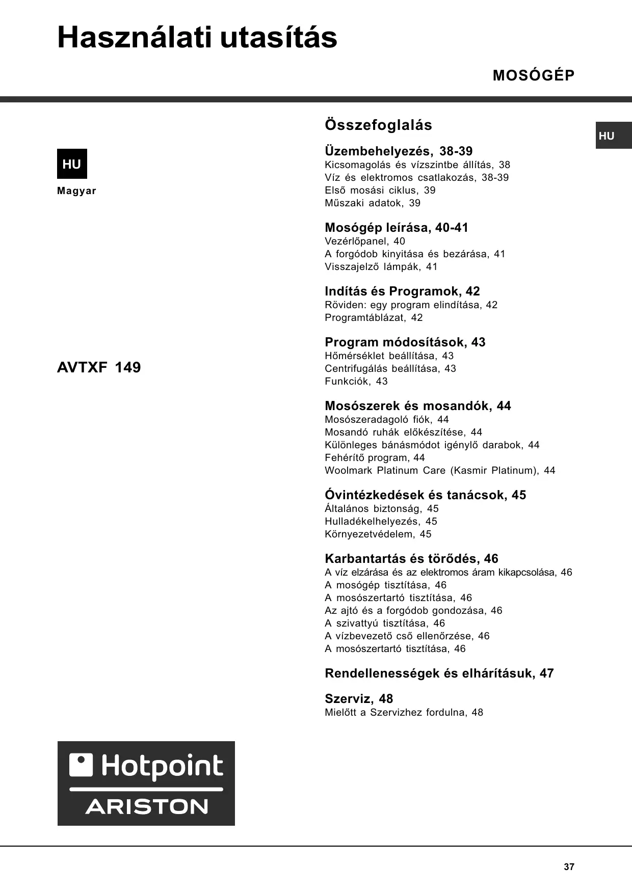 Téléchargez la notice de votre Mosógép au format PDF gratuitement ! Retrouvez votre notice AVTXF 149 - HOTPOINT-ARISTON et reprennez votre appareil électronique en main. Sur cette page sont publiés tous les documents nécessaires à l'utilisation de votre appareil AVTXF 149 de la marque HOTPOINT-ARISTON.