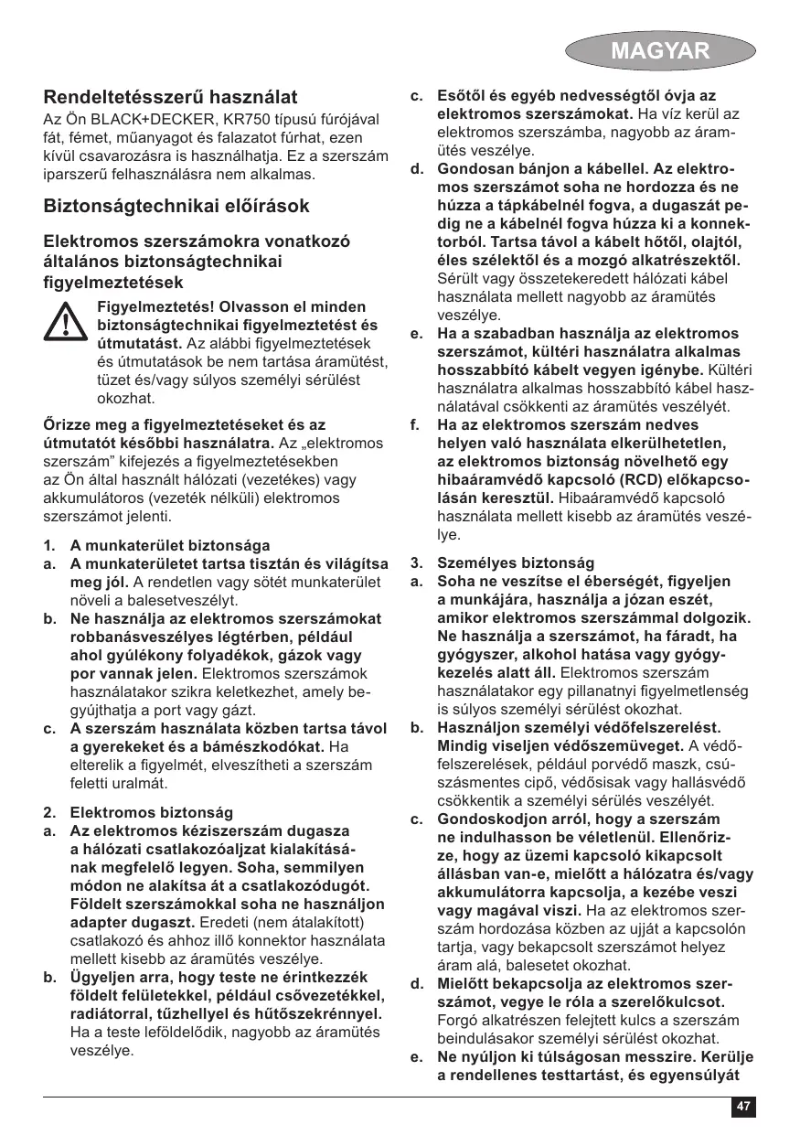 MAGYAR Rendeltetésszerű használat Az Ön BLACK+DECKER, KR750 típusú fúrójával fát, fémet, műanyagot és falazatot fúrhat, ezen kívül csavarozásra is használhatja. Ez a szerszám iparszerű felhasználásra nem alkalmas.