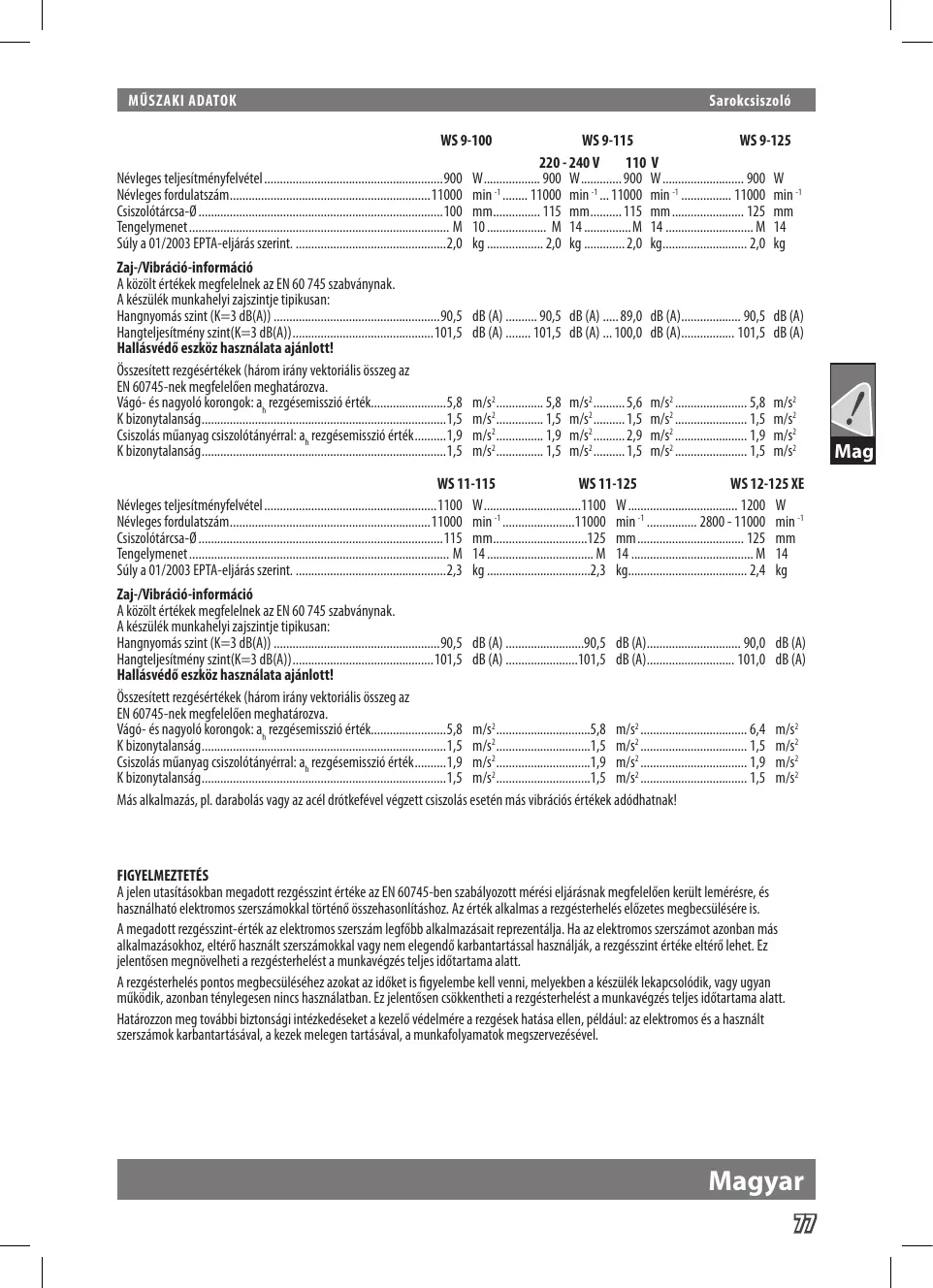 110 V Névleges teljesítményfelvétel..........................................................900 W................... 900 W.............. 900 W........................... 900 W Névleges fordulatszám.................................................................11000 min -1......... 11000 min -1.... 11000 min -1................. 11000 min -1 Csiszolótárcsa-Ø...............................................................................100 mm................ 115 mm........... 115 mm........................ 125 mm Tengelymenet.................................................................................... M 10.................... M 14................M 14............................. M 14 Súly a 01/2003 EPTA-eljárás szerint..................................................2,0 kg................... 2,0 kg.............. 2,0 kg............................ 2,0 kg Zaj-/Vibráció-információ A közölt értékek megfelelnek az EN 60 745 szabványnak. A készülék munkahelyi zajszintje tipikusan: Hangnyomás szint (K=3 dB(A))......................................................90,5 dB (A)........... 90,5 dB (A)...... 89,0 dB (A).................... 90,5 dB (A) Hangteljesítmény szint(K=3 dB(A))..............................................101,5 dB (A)......... 101,5 dB (A).... 100,0 dB (A).................. 101,5 dB (A) Hallásvédő eszköz használata ajánlott! Összesített rezgésértékek (három irány vektoriális összeg az EN 60745-nek megfelelően meghatározva. Vágó- és nagyoló korongok: ah rezgésemisszió érték........................5,8 m/s2. .............. 5,8 m/s2........... 5,6 m/s2........................ 5,8 m/s2 K bizonytalanság...............................................................................1,5 m/s2. .............. 1,5 m/s2........... 1,5 m/s2........................ 1,5 m/s2 Csiszolás műanyag csiszolótányérral: ah rezgésemisszió érték...........1,9 m/s2. .............. 1,9 m/s2........... 2,9 m/s2........................ 1,9 m/s2 K bizonytalanság...............................................................................1,5 m/s2. .............. 1,5 m/s2........... 1,5 m/s2........................ 1,5 m/s2 WS 11-115 WS 11-125 WS 12-125 XE Névleges teljesítményfelvétel........................................................1100 W................................1100 W.................................... 1200 W Névleges fordulatszám.................................................................11000 min -1........................11000 min -1................. 2800 - 11000 min -1 Csiszolótárcsa-Ø...............................................................................115 mm...............................125 mm................................... 125 mm Tengelymenet.................................................................................... M 14................................... M 14........................................ M 14 Súly a 01/2003 EPTA-eljárás szerint..................................................2,3 kg..................................2,3 kg....................................... 2,4 kg Zaj-/Vibráció-információ A közölt értékek megfelelnek az EN 60 745 szabványnak. A készülék munkahelyi zajszintje tipikusan: Hangnyomás szint (K=3 dB(A))......................................................90,5 dB (A)..........................90,5 dB (A)............................... 90,0 dB (A) Hangteljesítmény szint(K=3 dB(A))..............................................101,5 dB (A)........................101,5 dB (A)............................. 101,0 dB (A) Hallásvédő eszköz használata ajánlott! Összesített rezgésértékek (három irány vektoriális összeg az EN 60745-nek megfelelően meghatározva. Vágó- és nagyoló korongok: ah rezgésemisszió érték........................5,8 m/s2. .............................5,8 m/s2................................... 6,4 m/s2 K bizonytalanság...............................................................................1,5 m/s2. .............................1,5 m/s2................................... 1,5 m/s2 Csiszolás műanyag csiszolótányérral: ah rezgésemisszió érték...........1,9 m/s2. .............................1,9 m/s2................................... 1,9 m/s2 K bizonytalanság...............................................................................1,5 m/s2. .............................1,5 m/s2................................... 1,5 m/s2 Más alkalmazás, pl. darabolás vagy az acél drótkefével végzett csiszolás esetén más vibrációs értékek adódhatnak! FIGYELMEZTETÉS A jelen utasításokban megadott rezgésszint értéke az EN 60745-ben szabályozott mérési eljárásnak megfelelően került lemérésre, és használható elektromos szerszámokkal történő összehasonlításhoz. Az érték alkalmas a rezgésterhelés előzetes megbecsülésére is. A megadott rezgésszint-érték az elektromos szerszám legfőbb alkalmazásait reprezentálja. Ha az elektromos szerszámot azonban más alkalmazásokhoz, eltérő használt szerszámokkal vagy nem elegendő karbantartással használják, a rezgésszint értéke eltérő lehet. Ez jelentősen megnövelheti a rezgésterhelést a munkavégzés teljes időtartama alatt. A rezgésterhelés pontos megbecsüléséhez azokat az időket is figyelembe kell venni, melyekben a készülék lekapcsolódik, vagy ugyan működik, azonban ténylegesen nincs használatban. Ez jelentősen csökkentheti a rezgésterhelést a munkavégzés teljes időtartama alatt. Határozzon meg további biztonsági intézkedéseket a kezelő védelmére a rezgések hatása ellen, például: az elektromos és a használt szerszámok karbantartásával, a kezek melegen tartásával, a munkafolyamatok megszervezésével. Magyar