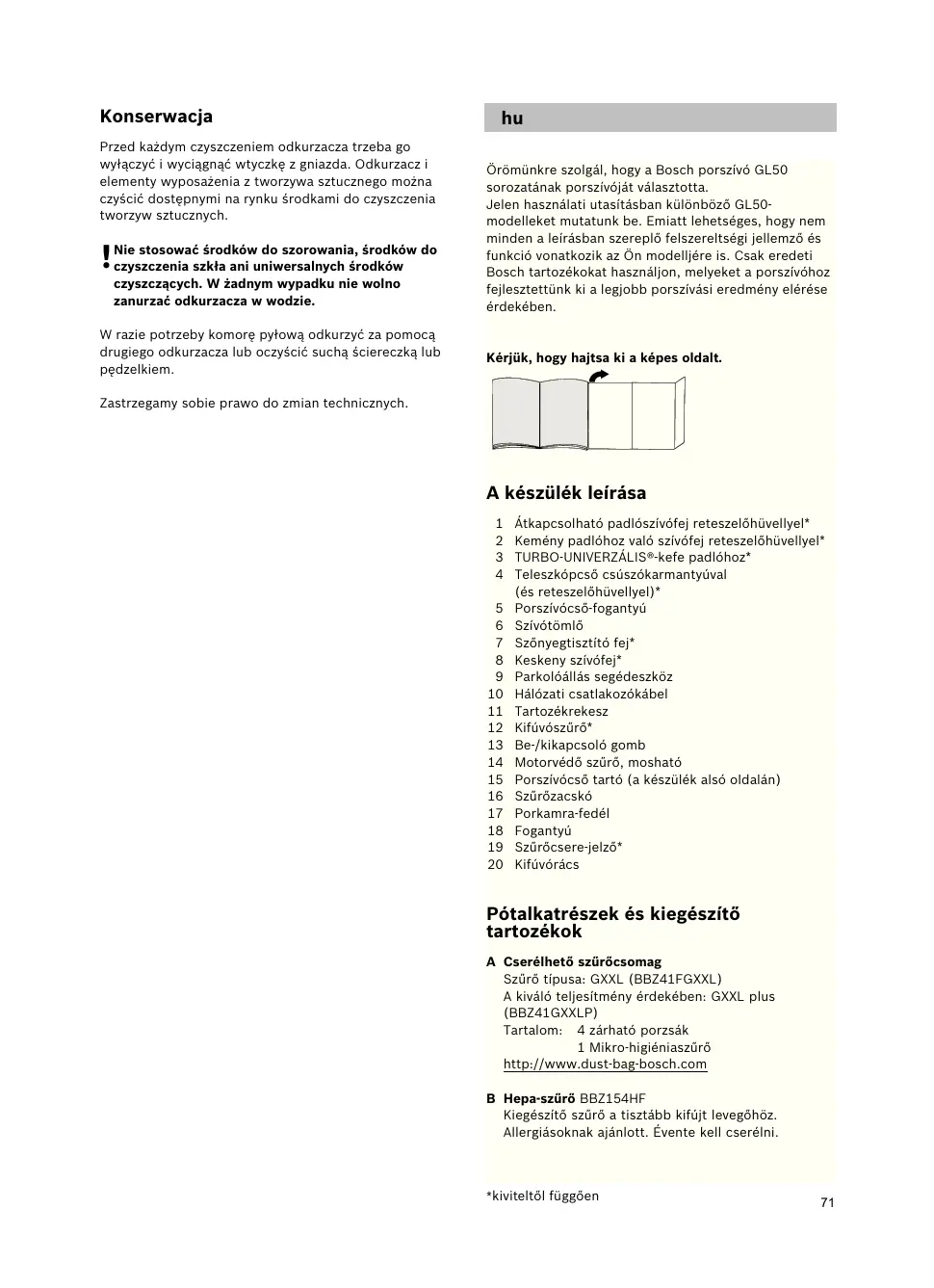 Jelen hasznalatiutasitásban kulönbozó GL50-modelleket mutatunk be. Emiatt lehetséges, hogy nem\ möden a leirásban szereplő felszereltségí jellemzó és\ funkci vonatkozik az On modelljère is. Csak eredeti Bosch tartozékokat hasznaljon, melyeket a porszivohoz\ fejisztettunki ka I legjobb porszivási eredmény elérésé erdekében.
