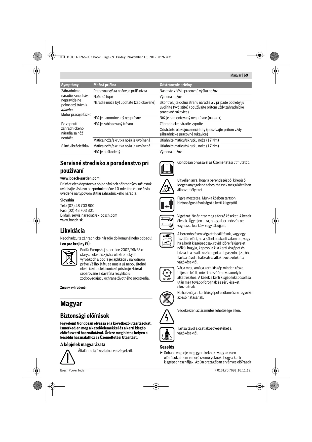 Hľadanie porúch STOP Symptómy Motor sa nerozbehne Možná príčina Výpadok sieťového napätia Zásuvka elektrickej siete je chybná Predlžovacia šnúra je poškodená Poistka vypadla Náradie môže byť upchaté (zablokované) Motorový istič sa inicioval Záhradnícke náradie beží prerušovane Nastavená pracovná výška je pre dané podmienky príliš nízka Predlžovacia šnúra je poškodená Odstránenie príčiny Skontrolujte a zapnite Použite inú zásuvku Skontrolovať prívodnú šnúru a v prípade, že je poškodená, ju vymeniť Vymeňte poistku Skontrolujte dolnú stranu náradia a v prípade potreby ju uvoľnite (vyčistite) (používajte pritom vždy záhradnícke pracovné rukavice) Nechajte motor vychladnúť a nastavte väčšiu pracovnú výšku nožov Nastavte väčšiu pracovnú výšku nožov Skontrolovať prívodnú šnúru a v prípade, že je poškodená, ju vymeniť Vnútorná kabeláž záhradníckeho náradia je Vyhľadajte autorizovanú servisnú opravovňu porušená Motorový istič sa inicioval Nechajte motor vychladnúť a nastavte väčšiu pracovnú výšku nožov F 016 L70 769 | (16.11.12) Bosch Power Tools OBJ_BUCH-1266-003.book Page 69 Friday, November 16, 2012 8:26 AM Magyar | 69 Symptómy Záhradnícke náradie zanecháva nepravidelne pokosený trávnik a/alebo Motor pracuje ťažko Po zapnutí záhradníckeho náradia sa nôž neotáča Silné vibrácie/hluk Možná príčina Pracovná výška nožov je príliš nízka Nože sú tupé Náradie môže byť upchaté (zablokované) Nôž je namontovaný nesprávne Nôž je zablokovaný trávou Matica noža/skrutka noža je uvoľnená Matica noža/skrutka noža je uvoľnená Nôž je poškodený Odstránenie príčiny Nastavte väčšiu pracovnú výšku nožov Výmena nožov Skontrolujte dolnú stranu náradia a v prípade potreby ju uvoľnite (vyčistite) (používajte pritom vždy záhradnícke pracovné rukavice) Nôž je namontovaný nesprávne (naopak) Záhradnícke náradie vypnite Odstráňte blokujúce nečistoty (používajte pritom vždy záhradnícke pracovné rukavice) Utiahnite maticu/skrutku noža (17 Nm) Utiahnite maticu/skrutku noža (17 Nm) Výmena nožov Servisné stredisko a poradenstvo pri používaní Gondosan olvassa el az Üzemeltetési útmutatót. www.bosch-garden.com Pri všetkých dopytoch a objednávkach náhradných súčiastok uvádzajte láskavo bezpodmienečne 10-miestne vecné číslo uvedené na typovom štítku záhradníckeho náradia. Ügyeljen arra, hogy a berendezésből kirepülő idegen anyagok ne sebesithessék meg a közelben álló személyeket. Figyelmeztetés: Munka közben tartson biztonságos távolságot a kerti kisgéptõl. Slovakia Tel.: (02) 48 703 800 Fax: (02) 48 703 801 E-Mail: servis.naradia@sk.bosch.com www.bosch.sk Vigyázat: Ne érintse meg a forgó késeket. A kések élesek. Ügyeljen arra, hogy a berendezés ne vághassa le a kéz- vagy lábujjait. Likvidácia A berendezésen végzett beállítások, vagy egy tisztítás előtt, ha a kábel beakadt valamibe, vagy ha a kerit kisgépet csak rövid időre felügyelet nélkül hagyja, kapcsolja ki a kerti kisgépet és húzza ki a csatlakozó dugót a dugaszolóaljzatból. Tartsa távol a hálózati csatlakozóvezetéket a vágókésektől. Várja meg, amíg a kerti kisgép minden része teljesen leállt, mieltt hozzáérne valamelyik alkatrészhez. A kések a kerti kisgép kikapcsolása után még tovább forognak és sérüléseket okozhatnak. Ne használja a kerti kisgépet esőben és ne tegye ki az eső hatásának. Neodhadzujte záhradnícke náradie do komunálneho odpadu! Len pre krajiny EÚ: Podľa Európskej smernice 2002/96/ES o starých elektrických a elektronických výrobkoch a podľa jej aplikácií v národnom práve Vášho štátu sa musia už nepoužiteľné elektrické a elektronické prístroje zbierať separovane a dávať na recykláciu zodpovedajúcu ochrane životného prostredia. Zmeny vyhradené. Magyar Védekezzen az áramütés lehetősége ellen. Biztonsági előírások Figyelem! Gondosan olvassa el a következő utasításokat. Ismerkedjen meg a kezelőelemekkel és a kerti kisgép előírásszerű használatával. Őrizze meg biztos helyen a későbbi használathoz az Üzemeltetési Utasítást. A képjelek magyarázata Általános tájékoztató a veszélyekről. Bosch Power Tools Tartsa távol a csatlakozóvezetéket a vágókésektől. Kezelés Sohase engedje meg gyerekeknek, vagy az ezen előírásokat nem ismerő személyeknek, hogy a kerti kisgépet használják. Az Ön országában érvényes előírások F 016 L70 769 | (16.11.12) OBJ_BUCH-1266-003.book Page 70 Friday, November 16, 2012 8:26 AM 70 | Magyar lehet hogy korlatozzák a kezelő korát. Ha a kerti kisgépet nem használja, azt gyermekek számára nem elérhető helyen tárolja. Ez a kerti kisgép nincs arra előirányozva, hogy azt olyan személyek (beleértve a gyerekeket) használják, akiknek a fizikai, érzékelési, vagy értelmi képességeik korlátozottak, vagy nincsenek meg a megfelelő tapasztalataik, illetve tudásuk, kivéve ha az ilyen személyekre a biztonságukért felelős más személy felügyel, vagy utasításokat ad arra, hogyan kell használni a kerti kisgépet. Gyerekeket nem szabad a kerti kisgéppel felügyelet nélkül hagyni, nehogy játsszanak a készülékkel. Sohase nyírjon füvet, ha a berendezés közvetlen közelében személyek, mindenek előtt gyerekek vagy háziállatok, tartózkodnak. A más személyek által elszenvedett balesetekért, illetve a más tulajdonában keletkezett károkért a kezelő vagy felhasználó felel. Ne használja a kerti kisgépet mezítláb vagy nyitott szandálban. Viseljen mindig stabil lábbelit és egy hosszú nadrágot. Gondosan vizsgálja meg a megmunkálni kívánt területet, és távolítsa el a köveket, botokat, drótokat, csontokat és egyéb idegen tárgyakat. A használat előtt mindig ellenőrizze, n