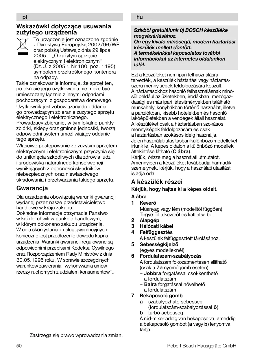 A készülék részei Kérjük, hogy hajtsa ki a képes oldalt. A ábra 1 Keverõ Mûanyag vagy fém (modelltõl függõen). Tegye föl a keverõt és kattintsa be. 2 Alapgép 3 Hálózati kábel 4 Felfüggesztés A készülék felfüggesztett tárolásához. 5 Sebességkijelzõ (egyes modelleknél) 6 Fordulatszám-szabályozás A fordulatszám fokozatmentesen állítható (csak a 7a nyomógomb esetén). – Jobbra forgatással csökkenthetõ a fordulatszám. – Balra forgatással növelhetõ a fordulatszám. 7 Bekapcsoló gomb a szabályozható sebesség (fordulatszám-szabályozással 6) b turbó-sebesség A rúd-mixer addig van bekapcsolva, ameddig a bekapcsoló gombot (a vagy b) lenyomva tartja. Robert Bosch Hausgeräte GmbH