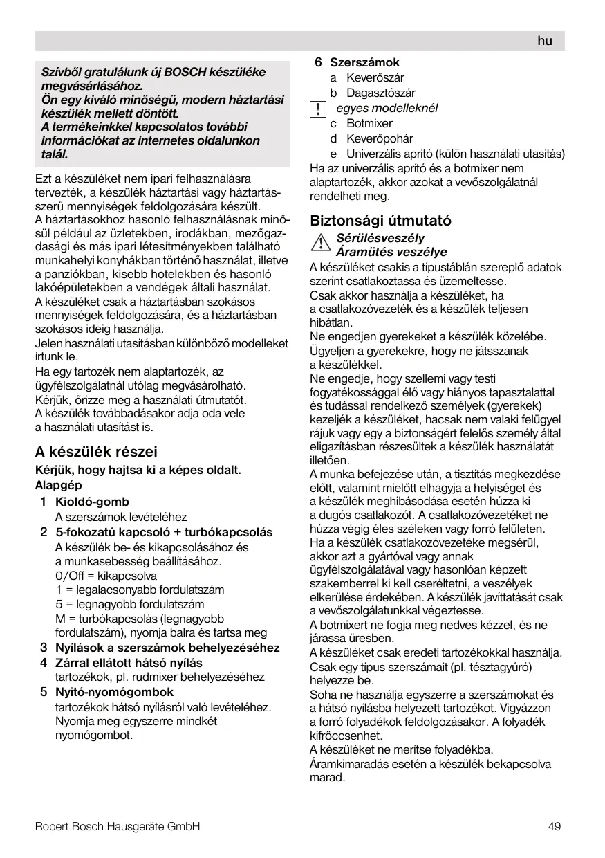 Szívbõl gratulálunk új BOSCH készüléke megvásárlásához. Ön egy kiváló minõségû, modern háztartási készülék mellett döntött. A termékeinkkel kapcsolatos további információkat az internetes oldalunkon talál. Ezt a készüléket nem ipari felhasználásra tervezték, a készülék háztartási vagy háztartásszerû mennyiségek feldolgozására készült. A háztartásokhoz hasonló felhasználásnak minõsül például az üzletekben, irodákban, mezõgazdasági és más ipari létesítményekben található munkahelyi konyhákban történõ használat, illetve a panziókban, kisebb hotelekben és hasonló lakóépületekben a vendégek általi használat. A készüléket csak a háztartásban szokásos mennyiségek feldolgozására, és a háztartásban szokásos ideig használja. Jelen használati utasításban különbözõ modelleket írtunk le. Ha egy tartozék nem alaptartozék, az ügyfélszolgálatnál utólag megvásárolható. Kérjük, õrizze meg a használati útmutatót. A készülék továbbadásakor adja oda vele a használati utasítást is.
